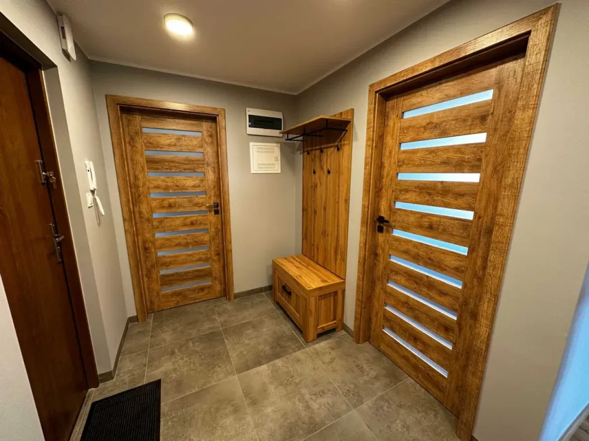Całoroczny wynajem na doby. W skład apartamentu wchodzi salon z aneksem kuchennym, dwie sypialnie, łazienka oraz korytarz.