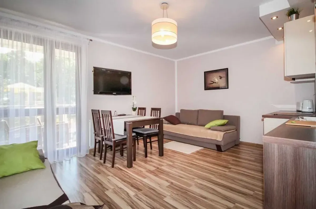 W Apartamencie: pokój dzienny z bardzo dobrze wyposażonym aneksem kuchennym (płyta indukcyjna, piekarnik, zmywarka, toster, lodówka, mikrofalówka, kawiarenka, pełen komplet naczyń), balkon położony idealnie aby odpoczywać wraz z wyposażeniem, łazienka z kabiną prysznicową oraz pralką. W pokoju znajdują się 2 duże rozkładane i wygodne sofy na których mogą komfortowo spać 4 osoby.