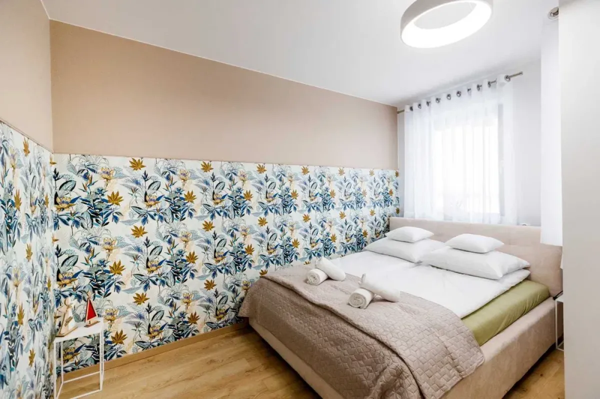 Dwie sypialnie z łóżkami 160x200 oraz rozkładana sofa w salonie. Klimatyzacja. W pełni wyposażona kuchnia m.in. lodówka, zmywarka, ekspres do kawy, sztućce, talerze.