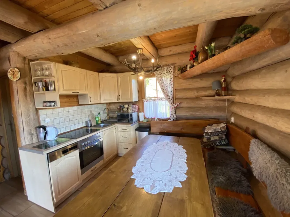 salon z w pełni wyposażoną kuchnią (lodówka z zamrażarką, zmywarka,mikrofalówka, kuchenka z piekarnikiem, czajnik, naczynia, sztućce) komplet skórzany z stolikiem, kominek, TV, Cyfra+, NETFLIX, oświetleniowy sprzęt dyskotekowy, łazienka z prysznicem, wyjście na taras.