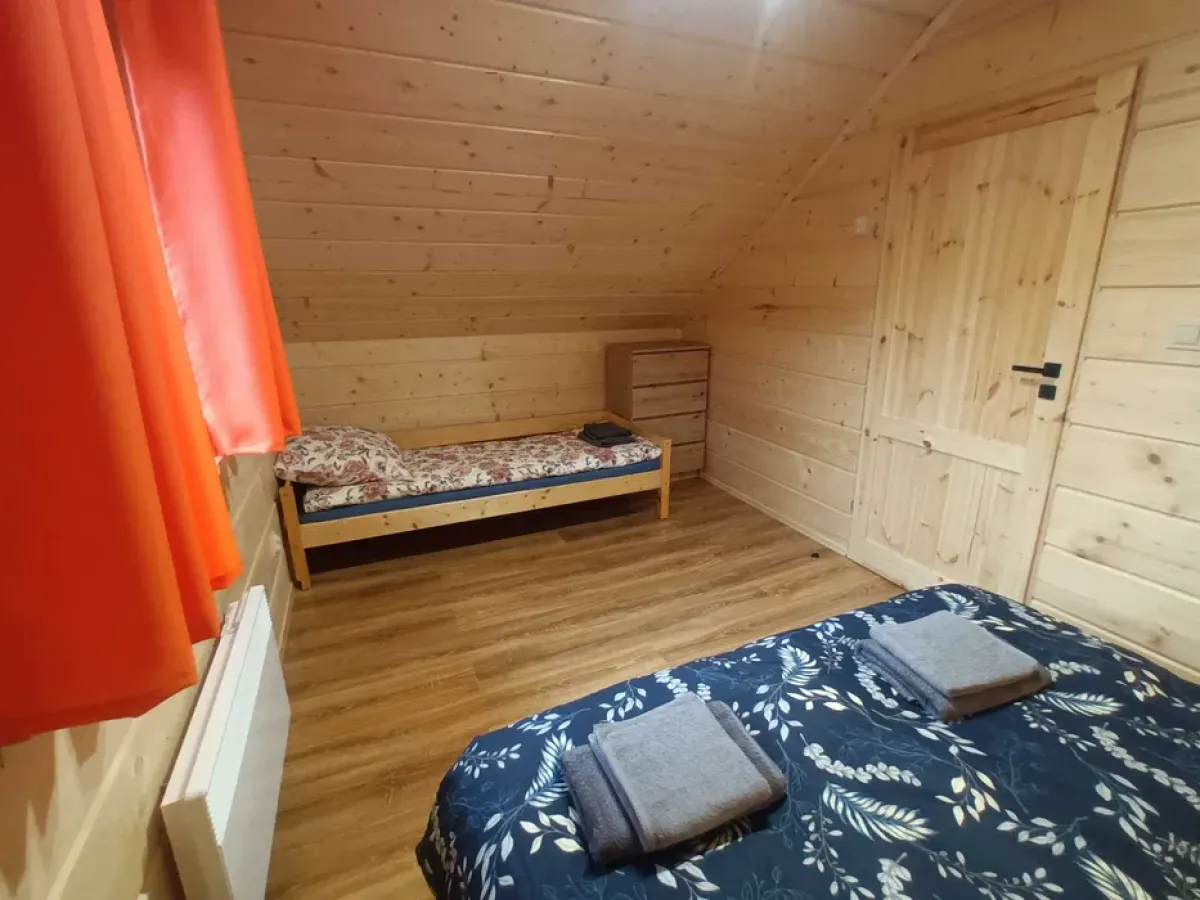 Każdy domek jest przeznaczony dla pobytu maksymalnie 8 osób, posiada salon z aneksem kuchennym z możliwością spania 2 osób, dwie sypialnie (po 3 osoby w każdej) oraz łazienkę wyposażoną w kabinę prysznicową. Do dyspozycji gości przygotowaliśmy pościel i ręczniki. Na wyposażeniu znajduje się również turystyczne łóżeczko dla maluszka. Będzie się u nas czuł jak w domu :)