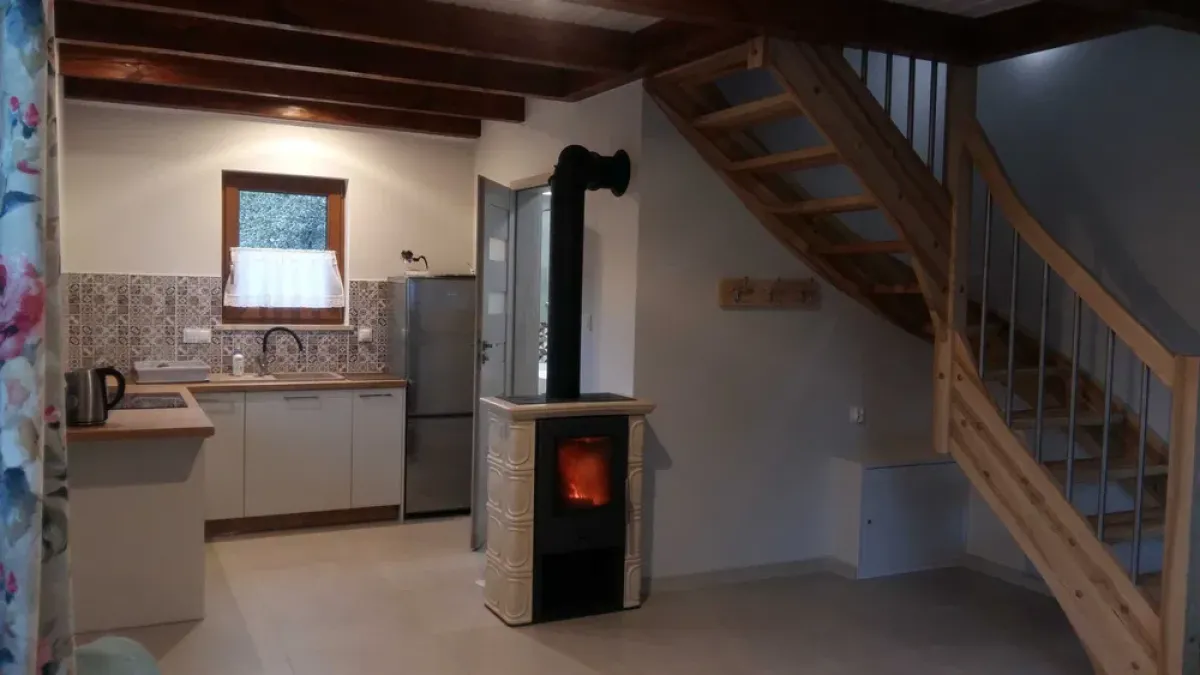 W domku w pełni wyposażona kuchnia; duża lodówka, płyta indukcyjna, mikrofalówka, garnki, naczynia, sztućce, łazienka z prysznicem, salon z kominkiem (rozkładana kanapa 2 osobowa), sypialnia 1 ( 2 łóżka pojedyncze) , sypialnia 2 ( 1 łóżko podwójne i 1 pojedyncze).