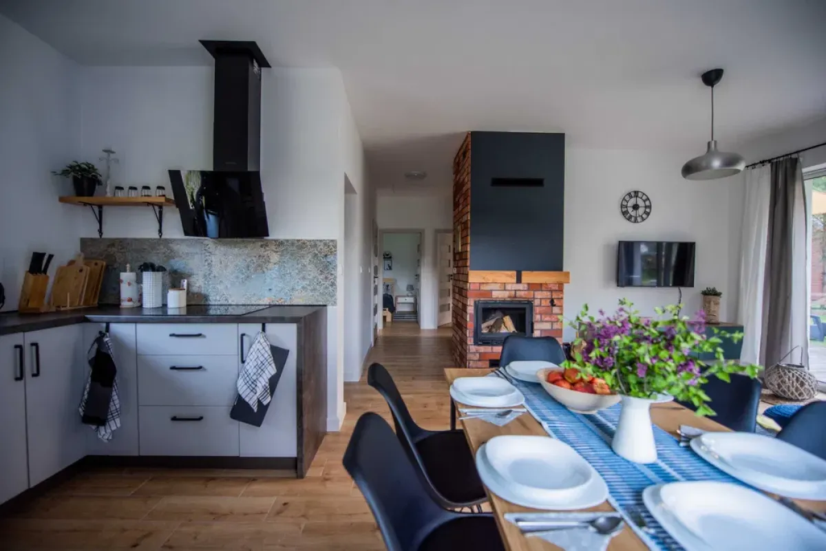 Domek w pełni wyposażony, znajdujący się wewnątrz kominek daje ogrzewanie w chłodniejsze dni. Okolica spokojna, sprzyjająca wycieczkom pieszym i rowerowym. W środku znajduje się salon z kominkiem, aneks kuchenny
