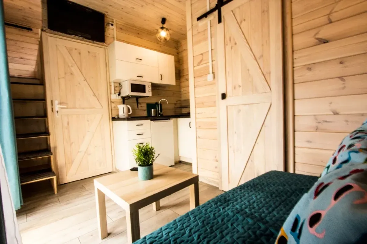 Międzywodziu przy ulicy Sportowej 3A. Oferujemy w pełni wyposażone domki z dużym tarasem, kuchnią, łazienką, sypialnią oraz antresolą do spania.