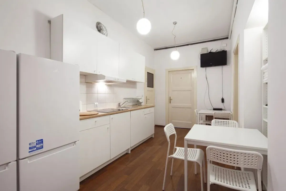 W pełni umeblowane, wyposażone w pojedyncze łóżka z kompletem pościeli oraz meblami na rzeczy osobiste. W lokalu niezbędne sprzęty AGD (kuchenka, pralka, lodówka) oraz akcesoria (szklanki, talerze, sztućce, garnki). Łącznie około 30 miejsc.