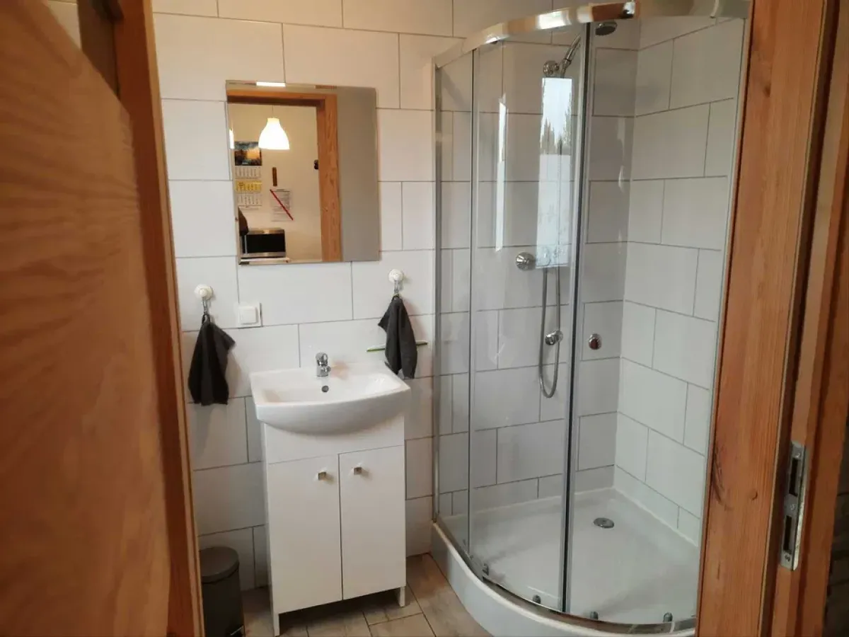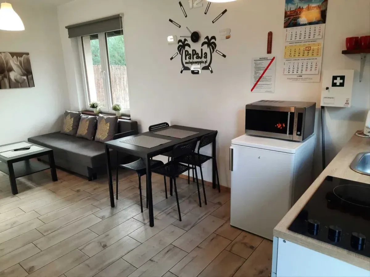 Kuchnia w pełni wyposażona: lodówka, płyta grzewcza, mikrofala, czajnik elektryczny, naczynia, talerze i sztućce.