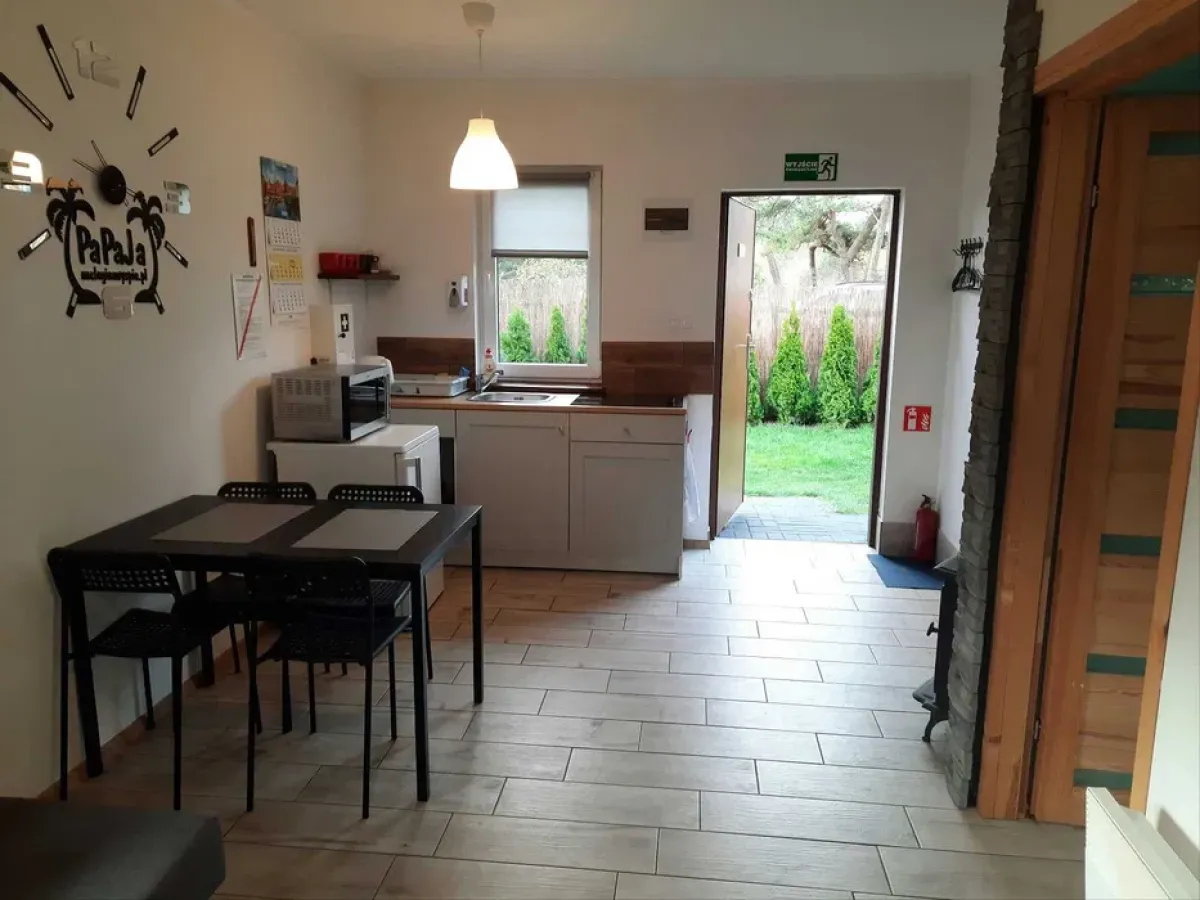 Kuchnia w pełni wyposażona: lodówka, płyta grzewcza, mikrofala, czajnik elektryczny, naczynia, talerze i sztućce.