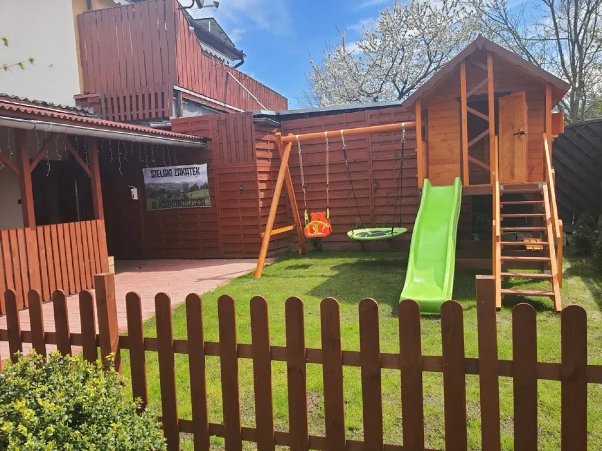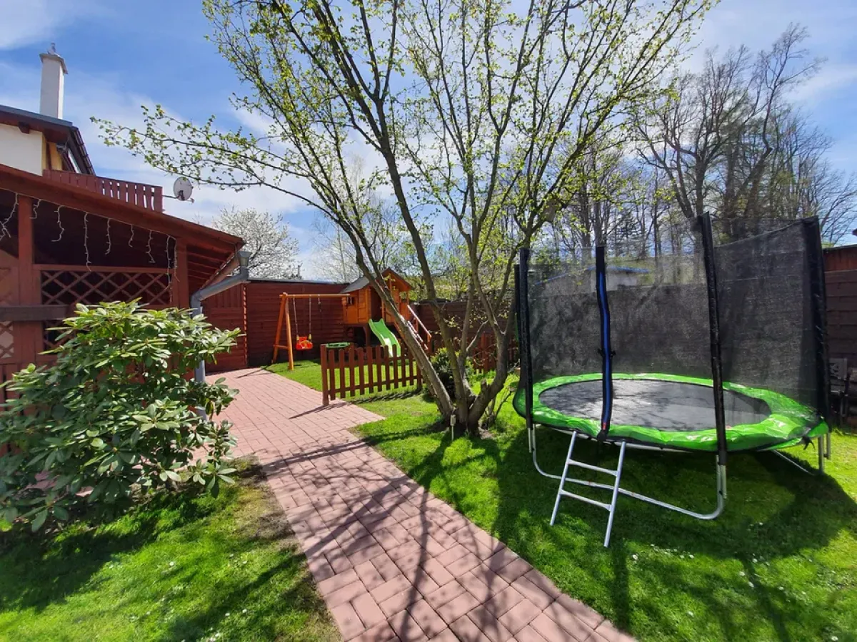 Przed domkiem znajduje się zadaszony taras z miejscem na grilla, ogródek z trampoliną oraz dwa miejsca parkingowe.