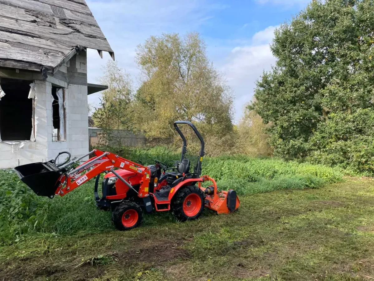 Minitraktor Kubota z ładowaczem czołowym 4w1 z glebogryzarką separacyjną GEO125. W ofercie również niwelator czołowy. Wynajem tylko z operatorem.
