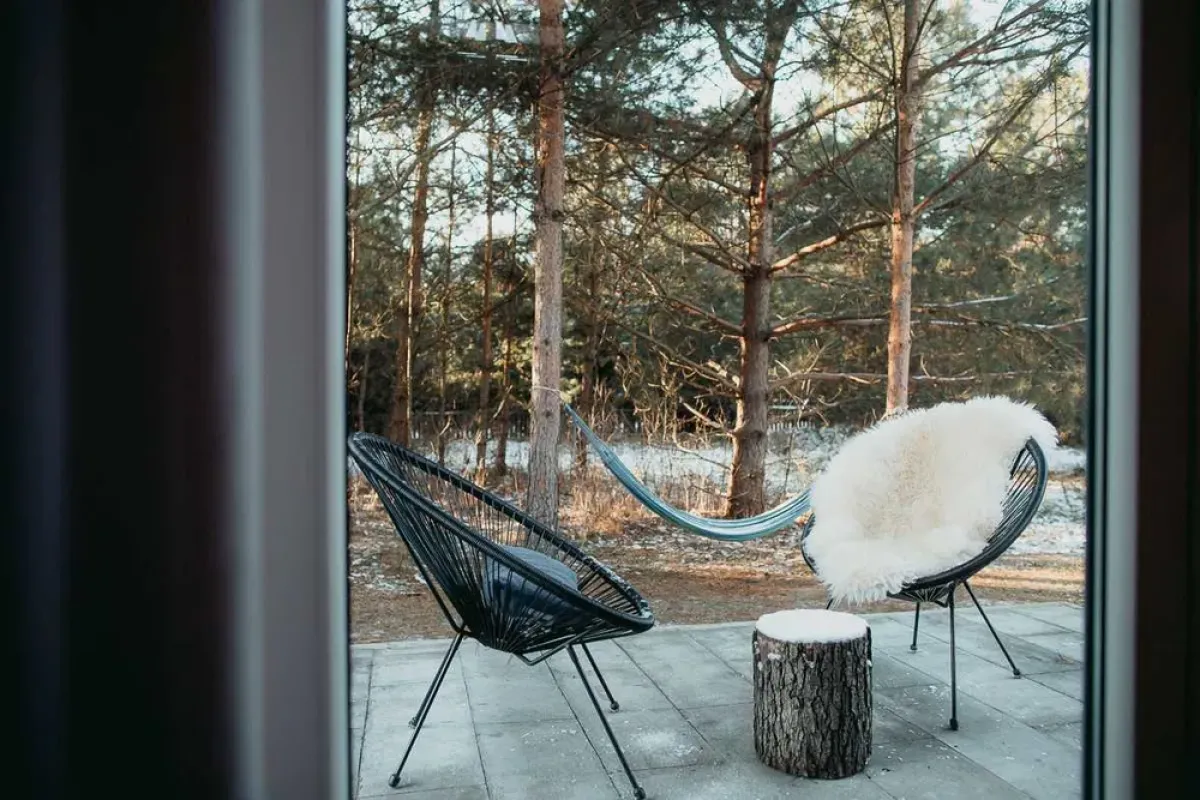Domki są wyposażone w wysokim standardzie, posiadają klimatyzację z pompą ciepła, kominek, duże tarasy, obok jest balia z jacuzzi, mini plaża z zabawkami, leżakami, miejscówka na ognicho i grilla. Za oknem zielono, mnóstwo ścieżek spacerowych i rowerowych wokół.
