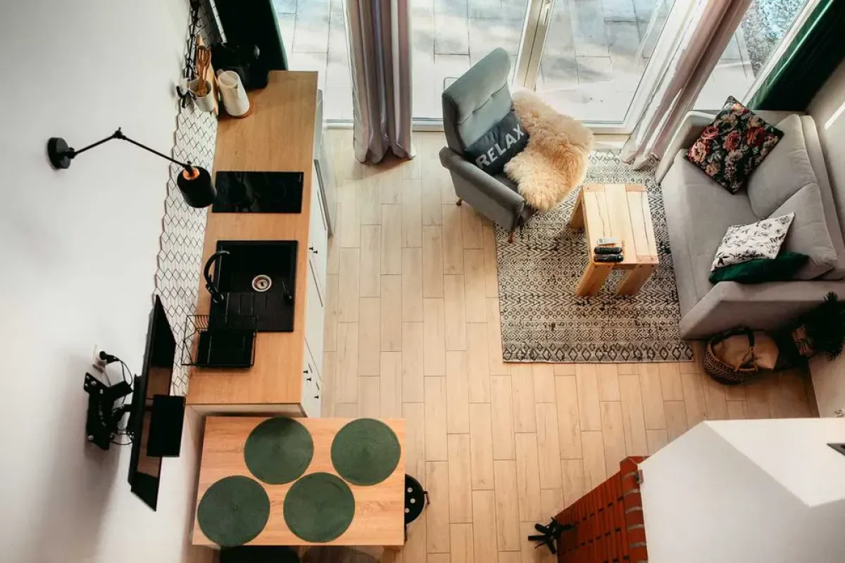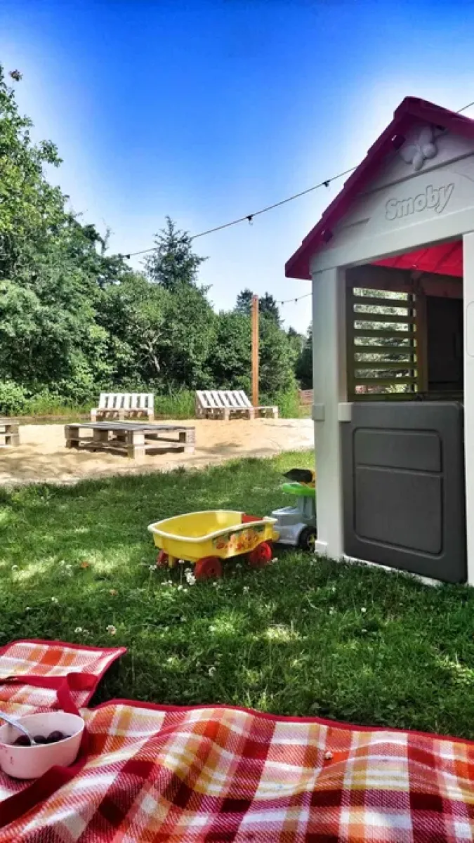 Wybudowaliśmy dwa wyjątkowe, drewniane domki – jeden parterowy, a drugi z antresolą. Obok nich postawiliśmy balię z jacuzzi, rowerownię, miejsce ogniskowe oraz usypaliśmy plażę z girlandami.