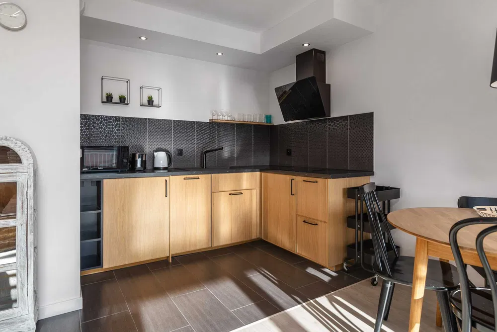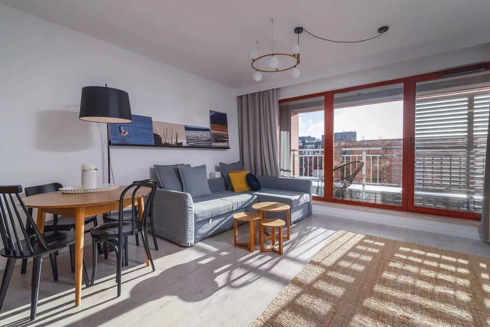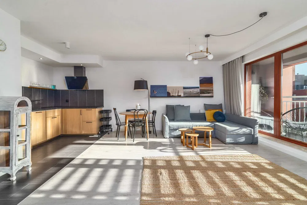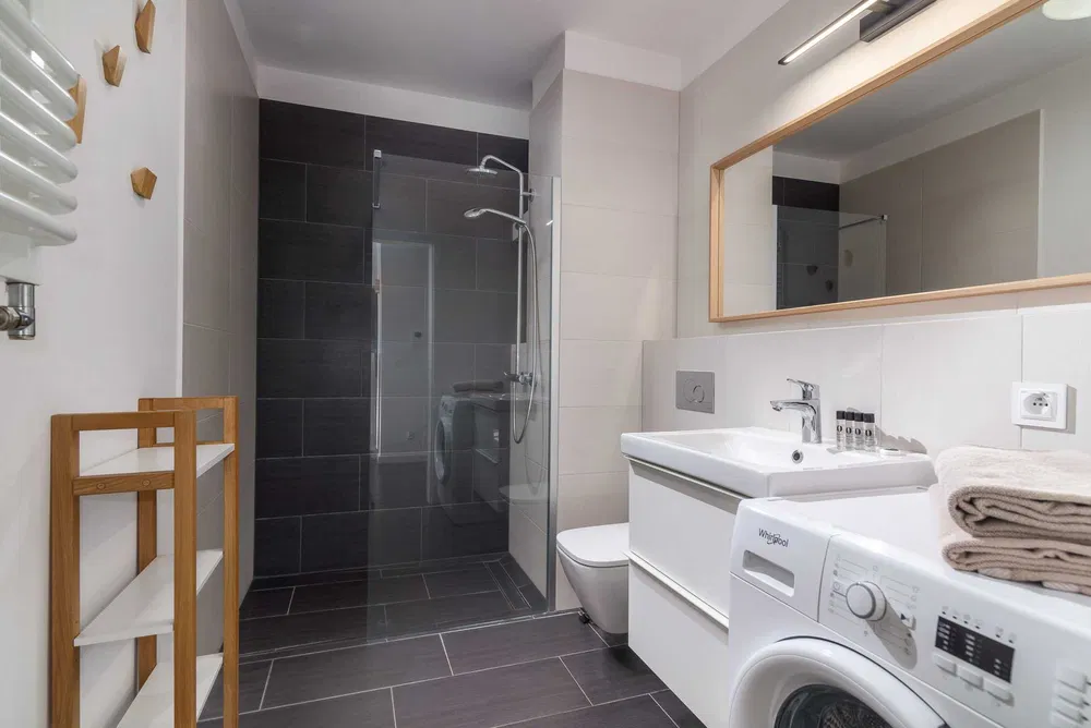 Apartament przygotowany jest maksymalnie dla 5 osób (jedna sypialnia łóżko 180x200, dwuosobowa sofa rozkładana w salonie, jednoosobowa sofa rozkładana w salonie). Dla gości przygotowany jest w pełni wyposażony aneks kuchenny w tym: kapsułkowy ekspres do kawy, zmywarka, lodówka z zamrażalnikiem, mikrofala oraz naczynia. W łazience zapewniono pralkę, suszarkę do włosów, kosmetyki do kąpieli, ręczniki i szlafroki do SPA.