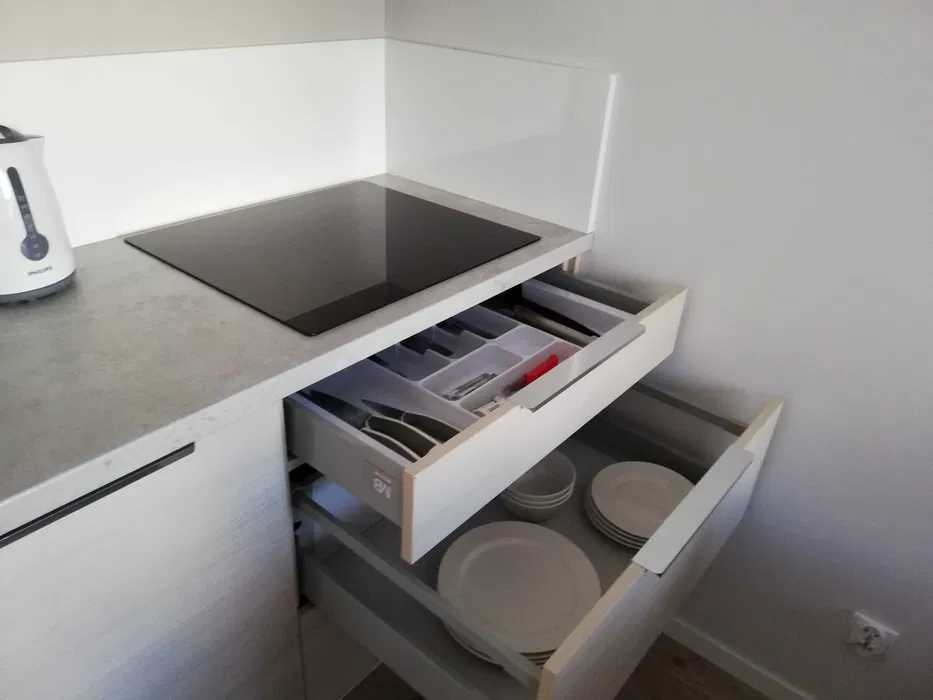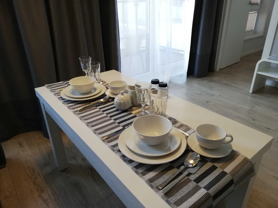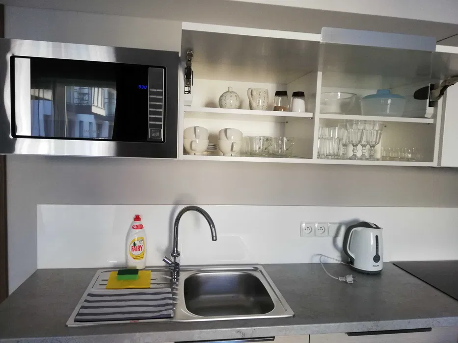 •kompletnie wyposażona kuchnia : sztućce, talerze, szklanki, kubki, kieliszki, naczynia, kuchenka mikrofalowa, lodówka z zamrażalnikiem, indukcyjna płyta grzewcza