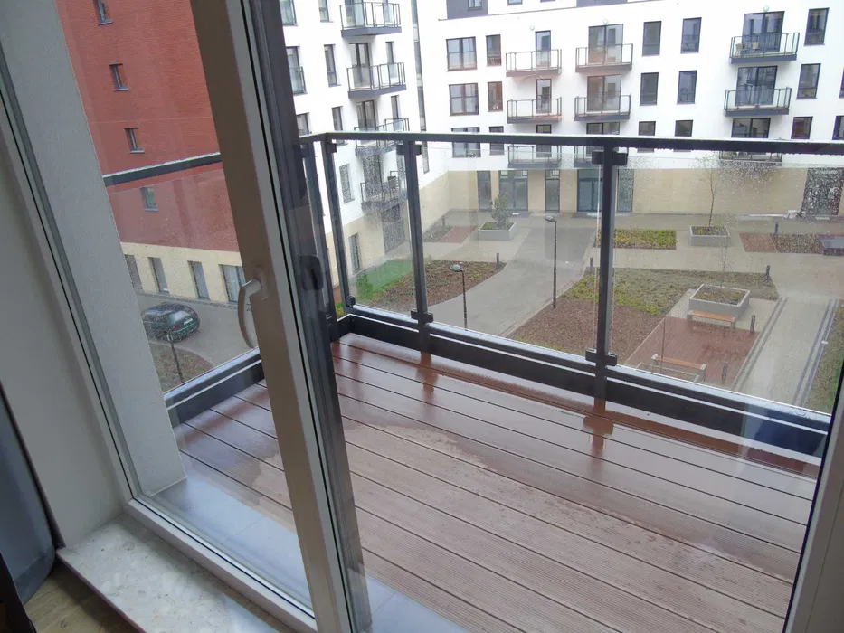 Okna apartamentu wychodzą na wewnętrzny dziedziniec osiedla, zapewniając ciszę i komfort wypoczynku.