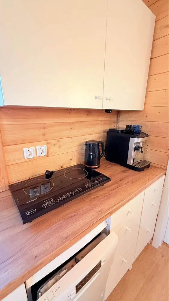 Salon z aneksem kuchennym (ekspres, zmywarka, lodówka,czajnik, oraz kuchenka)