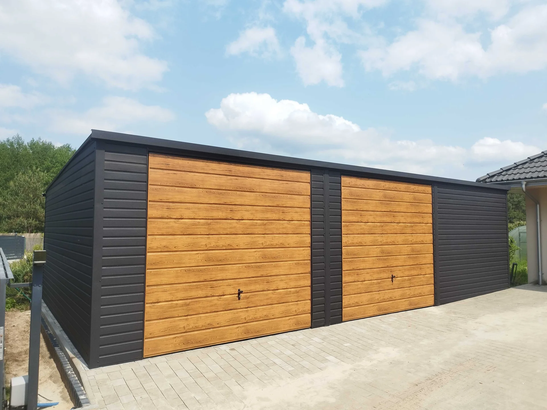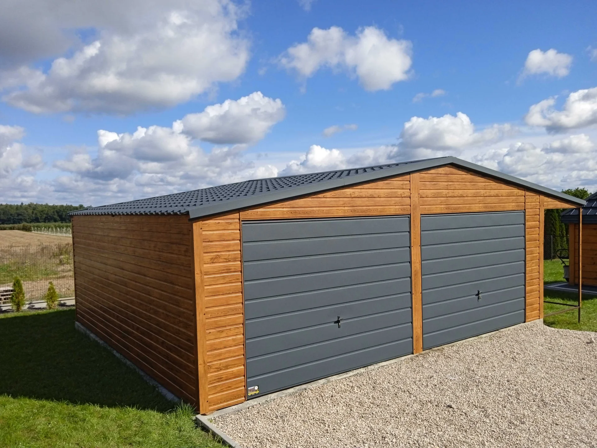 Dzięki zastosowaniu kolorystyki drewnopodobnej oraz szerokiemu trapezowi blachy przypominającemu deskę, nasze garaże w sposób efektywny komponują się z otoczeniem. Dodatkowym aspektem wizualnym są okucia blacharskie oraz pokrycie dachu blachodachówka które scalają garaż w spójną całość.
