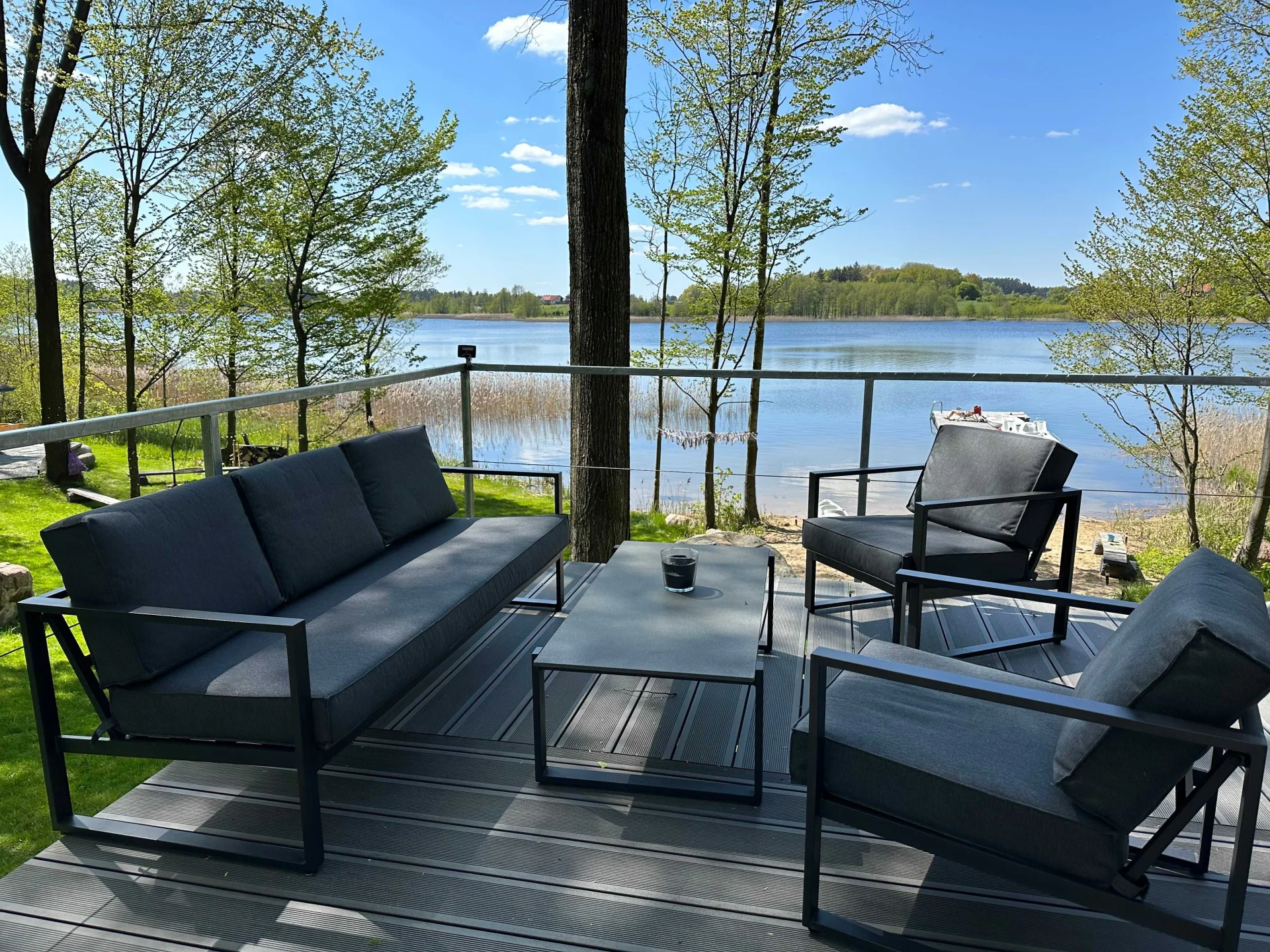 - duży taras z dużym rozkładanym stołem, krzesłami oraz wygodnym wypoczynkiem składającym się z kanapy, 2 foteli i stolika kawowego, leżaków,