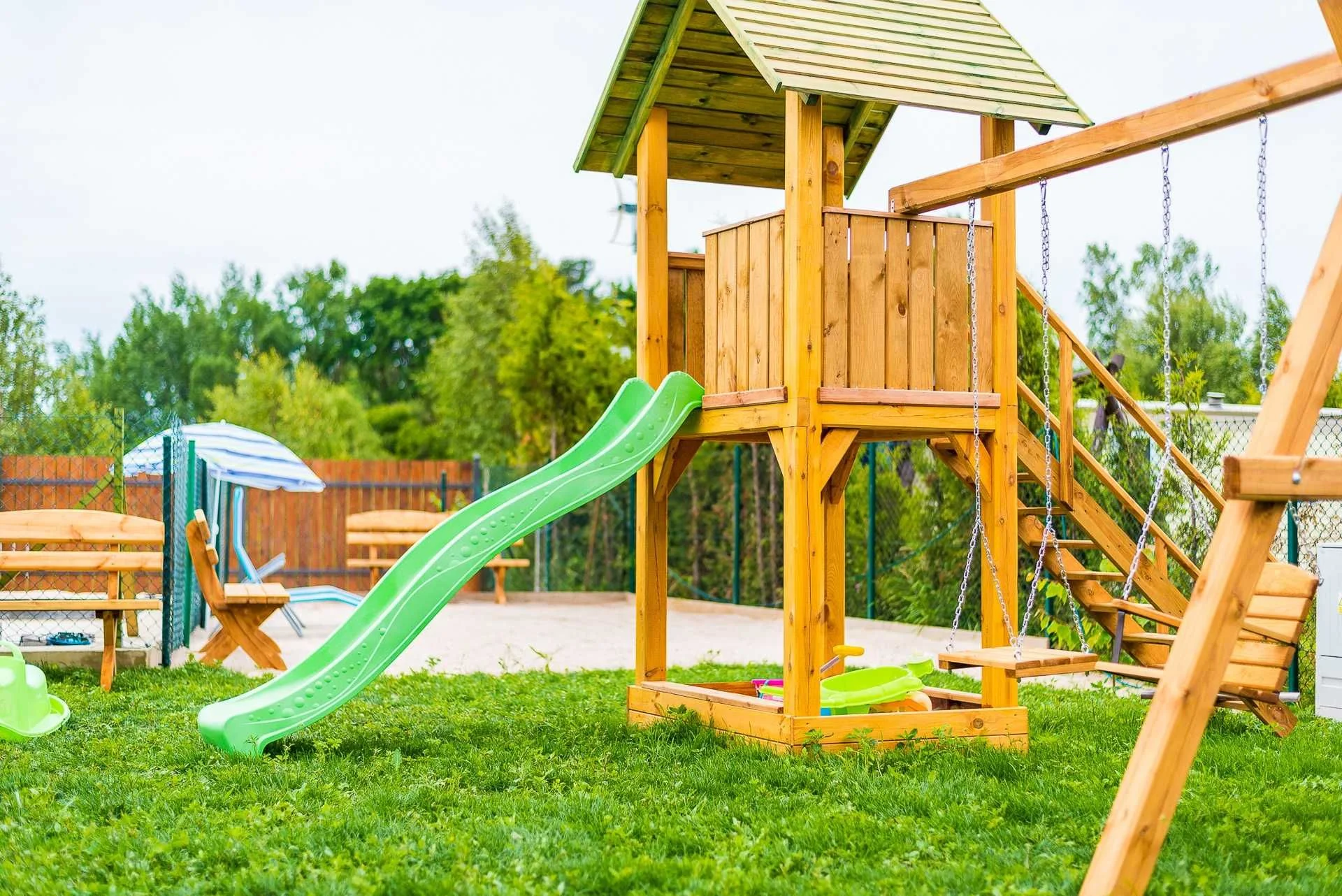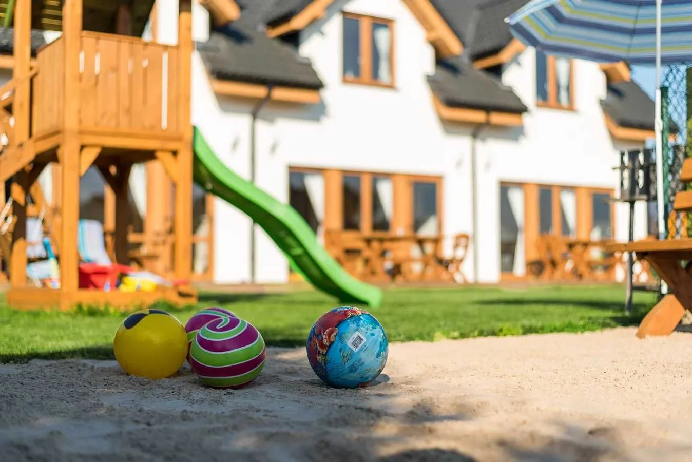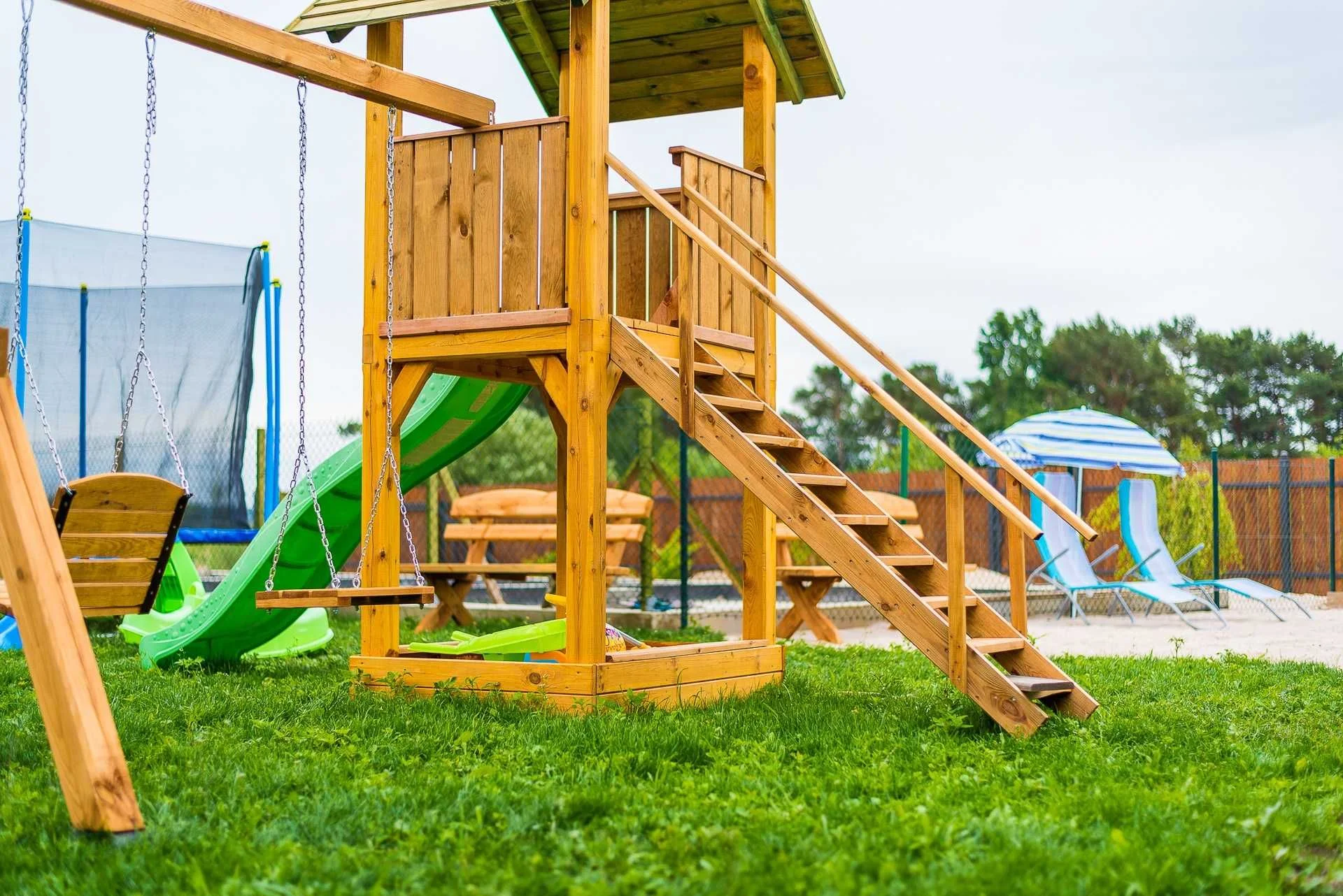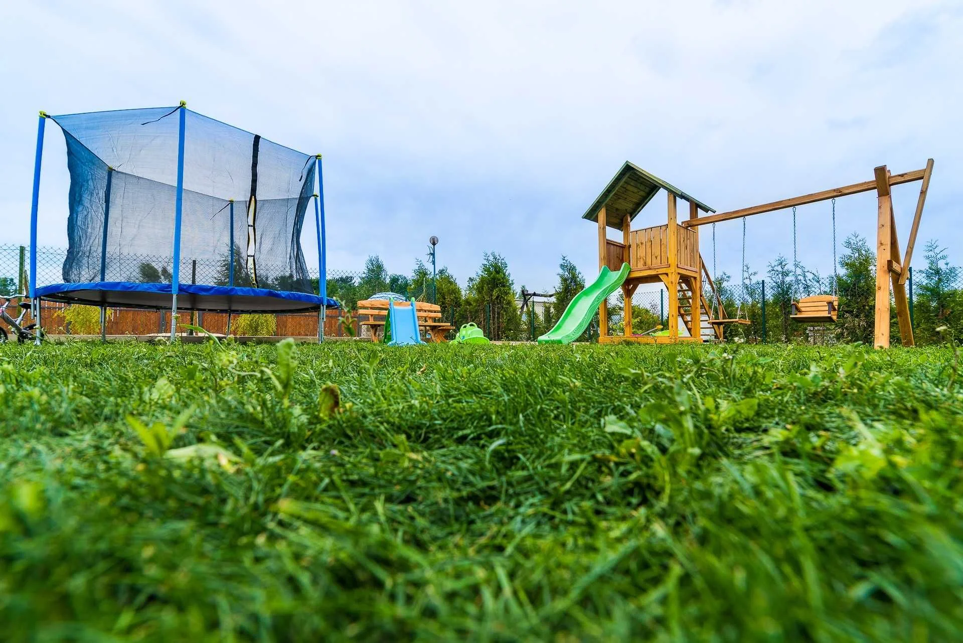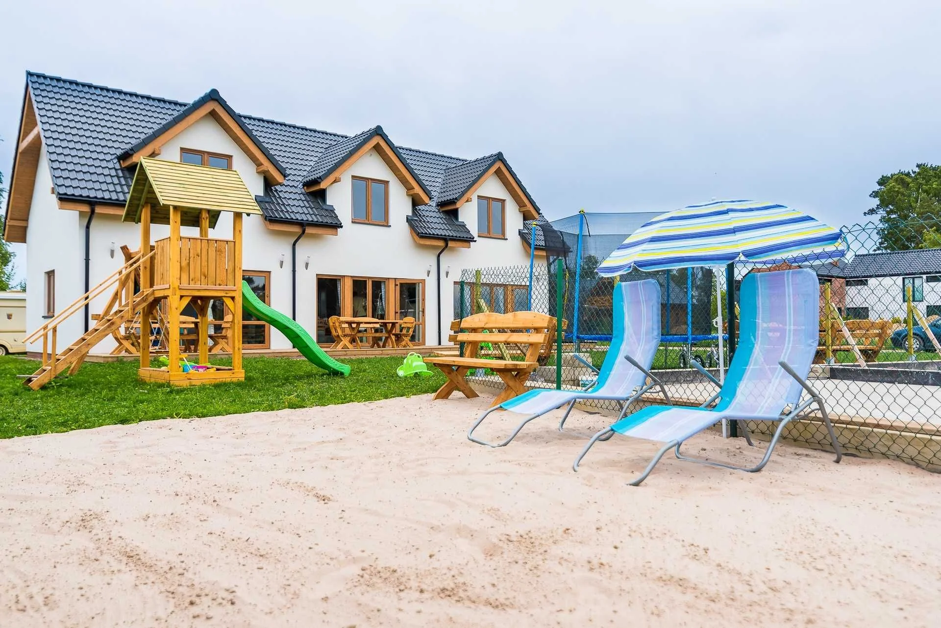 Cały teren jest ogrodzony. Na terenie plac zabaw dla dzieci oraz duża trampolina. Bezpłatnie do każdego domku zapewnione są dwa miejsca parkingowe. Dodatkowo komplet mebli ogrodowych na tarasie.