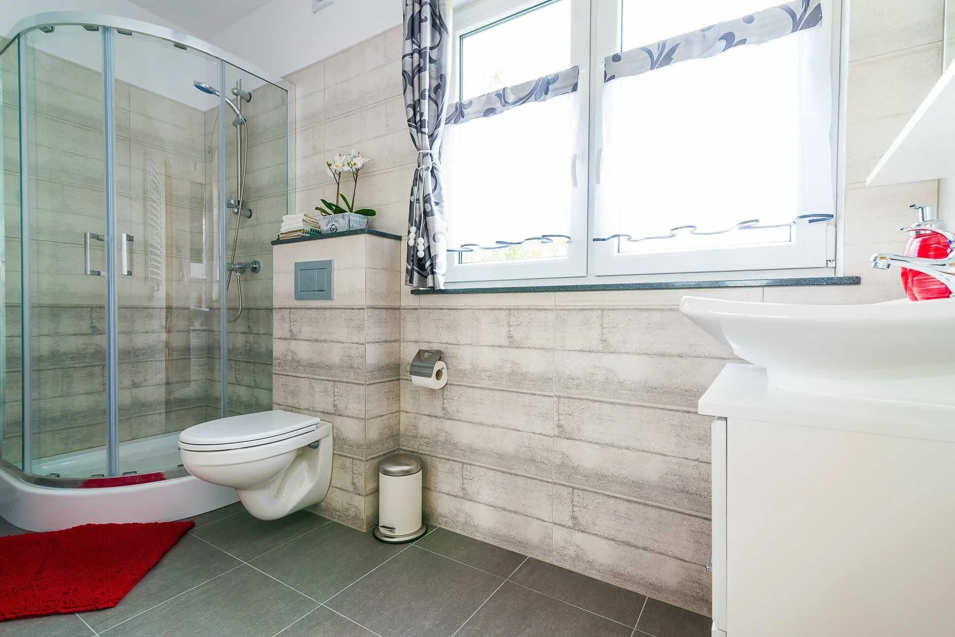 Łazienka- kabina prysznicowa, wc, umywalka.