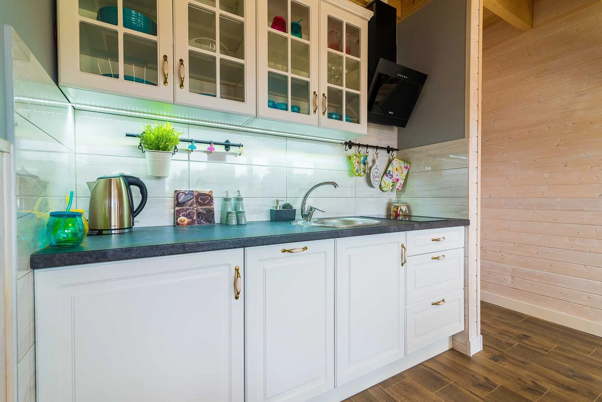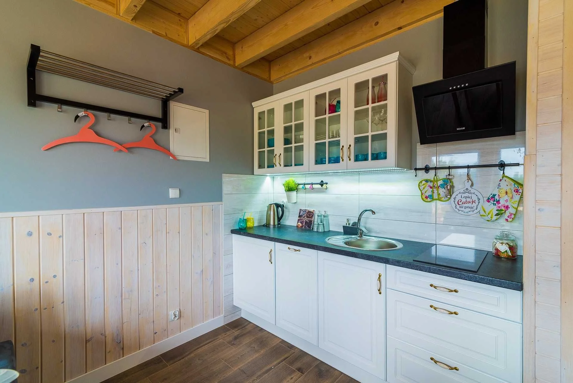 Kuchnia- zlewozmywak, zmywarka, płyta indukcyjna, lodówka, czajnik elektryczny, garnki, zestaw naczyń i sztućców.