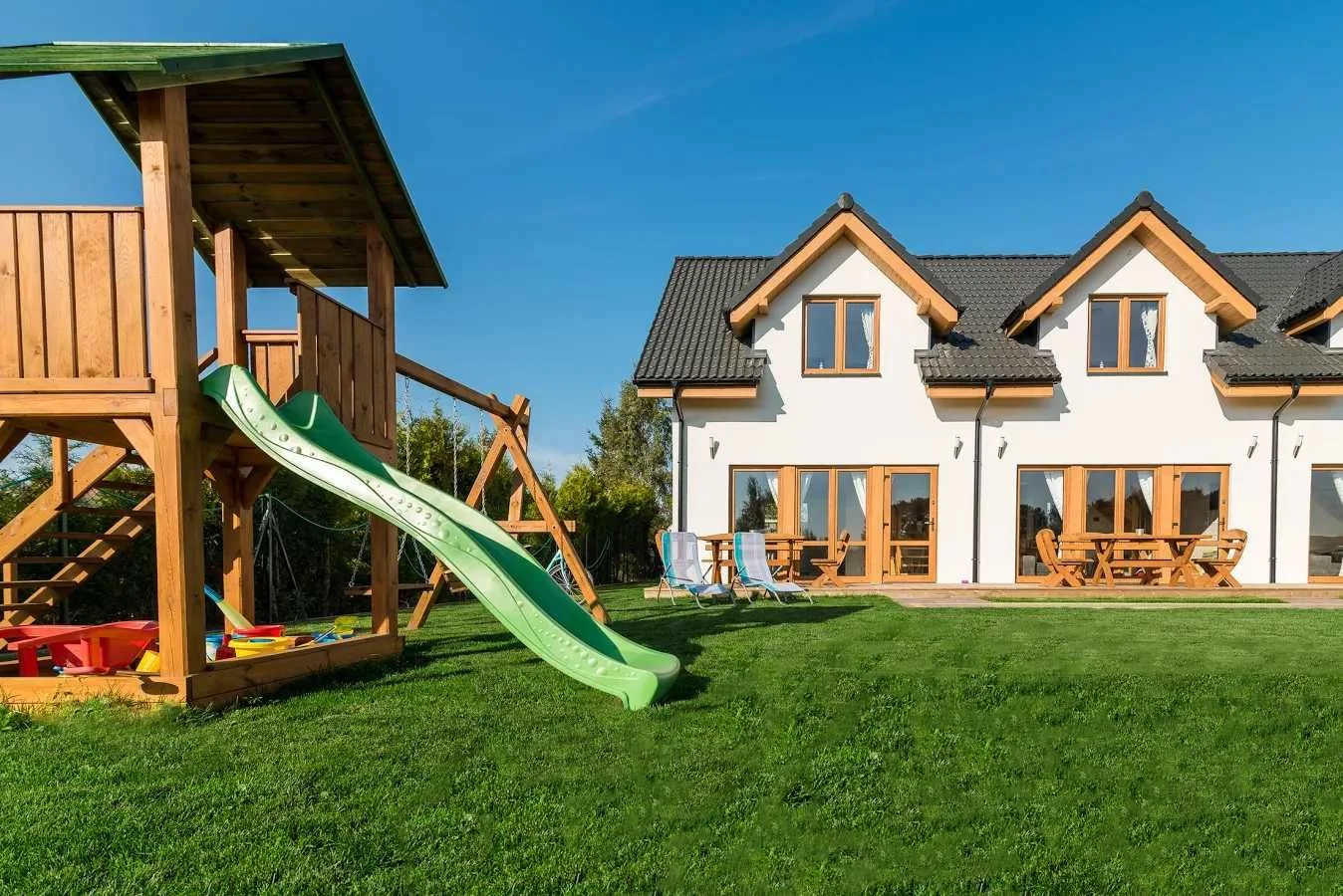Są one całoroczne (ocieplane oraz ogrzewane) składające się z salonu połączonego z w pełni wyposażoną kuchnią, łazienką oraz dwóch oddzielnych sypialni, znajdujących się na piętrze. Dla bezpieczeństwa naszych najmniejszych Gości zamontowaliśmy bramki na schodach.