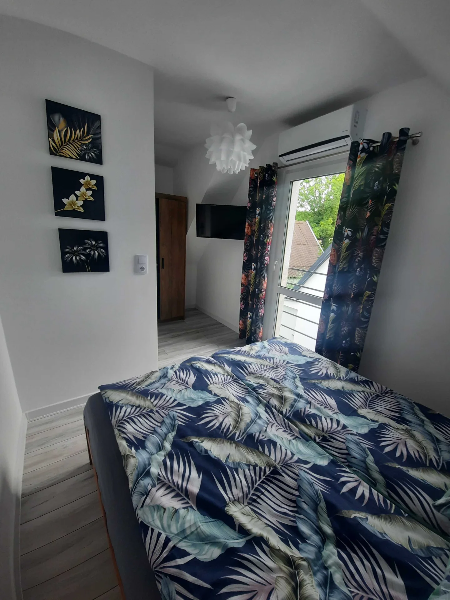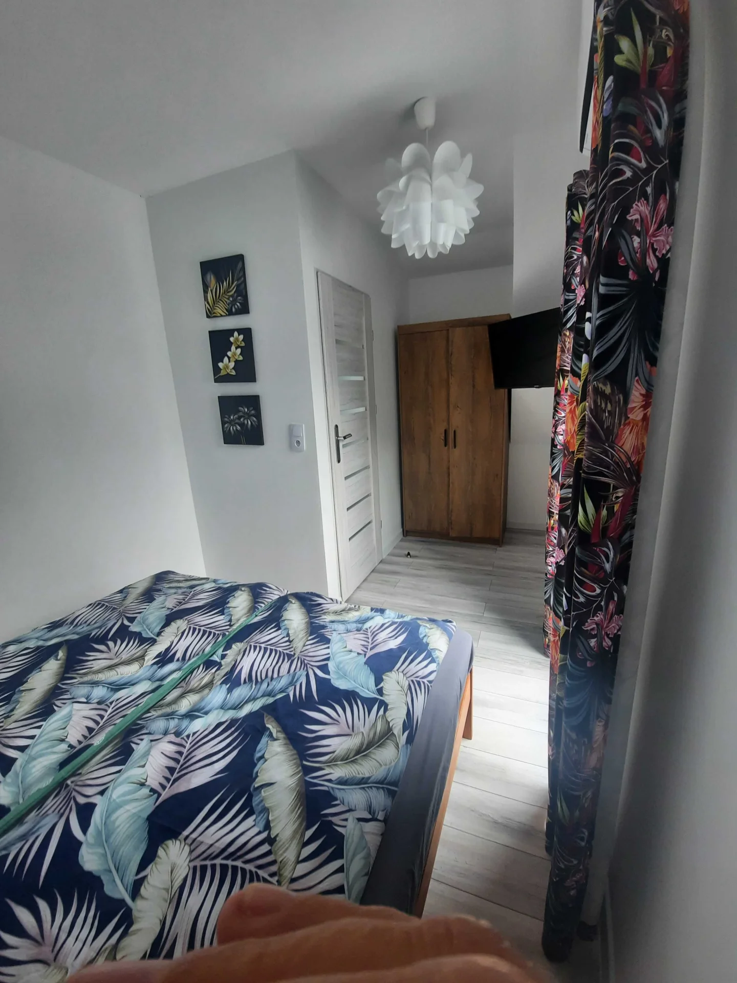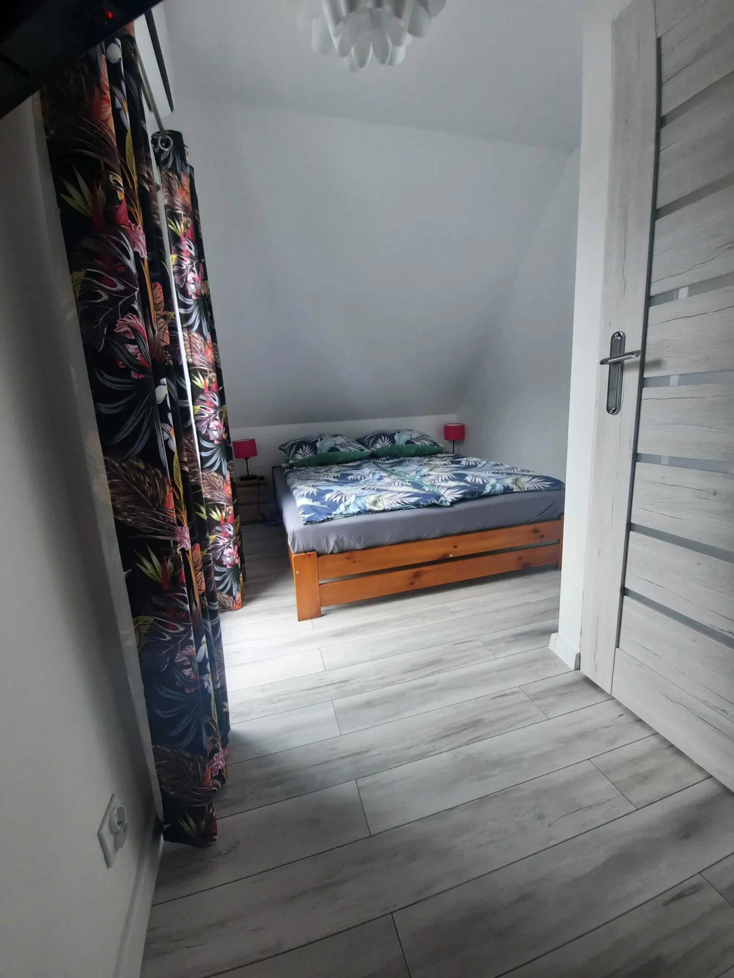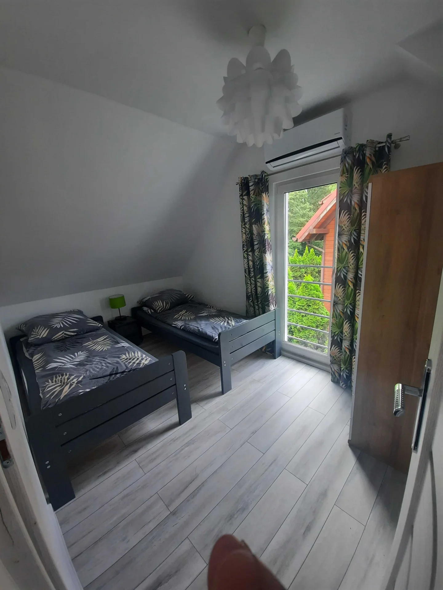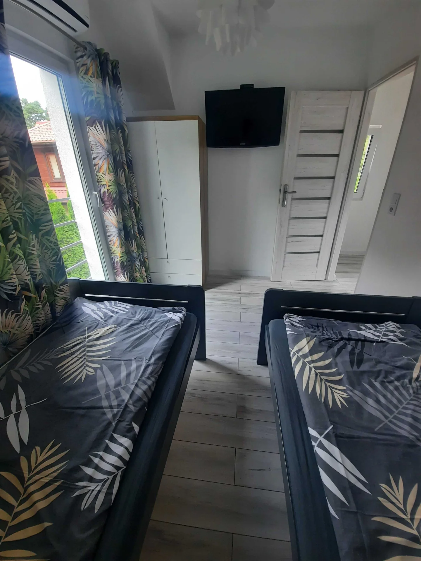 Na piętrze znajdują się dwie sypialnie, a w każdej z nich szafa, TV oraz łóżka w jednej sypialni łóżko dwuosobowe , a drugiej dwa łóżka pojedyncze.