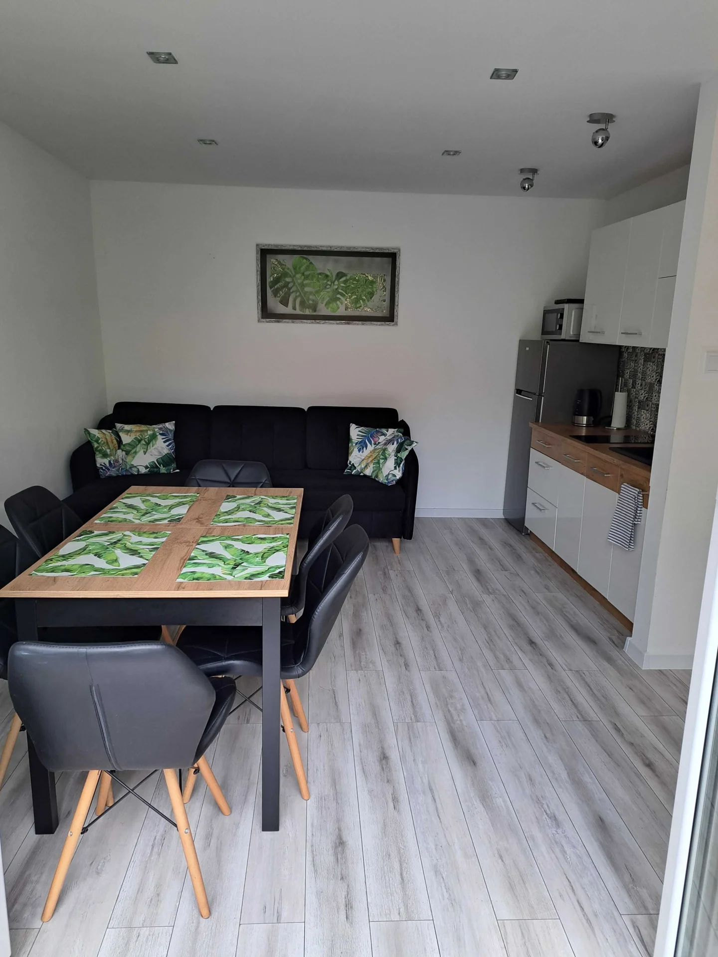 Domek jest piętrowy. Na parterze znajduje się łazienka z dużym prysznicem, salon wyposażony w kanapę narożną, TV, stół i 6 krzeseł oraz aneks kuchenny, na którego wyposażeniu jest :