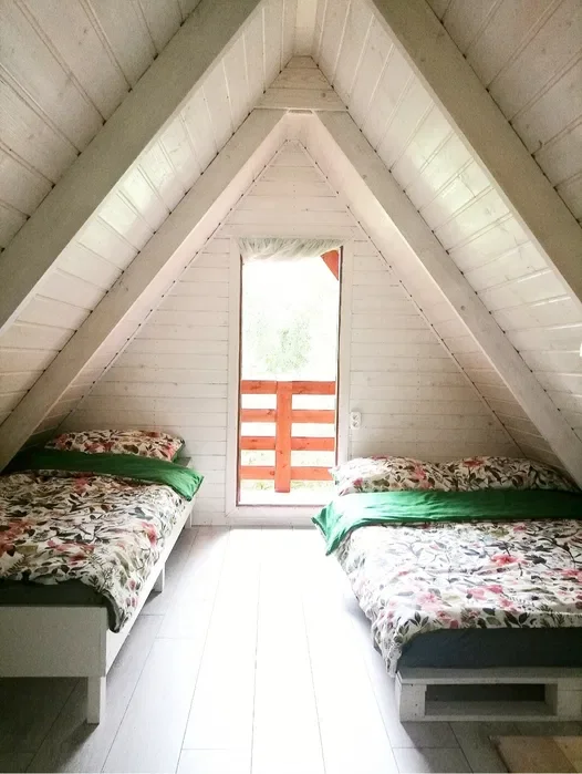 Powierzchnia domku to 20m2 parter plus piętro ze skosami. Na parterze jest salon z aneksem kuchennym i łazienka z kabiną prysznicową. W salonie znajduje się skórzany, wygodny komplet wypoczynkowy z rozkładaną kanapą. Na piętrze jest sypialna z trzema łóżkami. Jedno dwuosobowe i dwa pojedyncze.