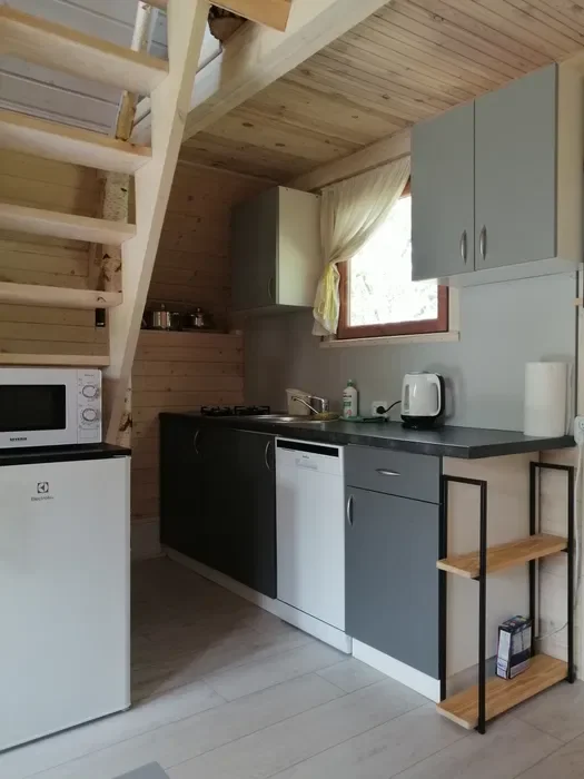 Kuchnia posiada niezbędne wyposażenie, takie jak: naczynia, kuchenka elektryczna, lodówka, mikrofalówka, czajnik bezprzewodowy.