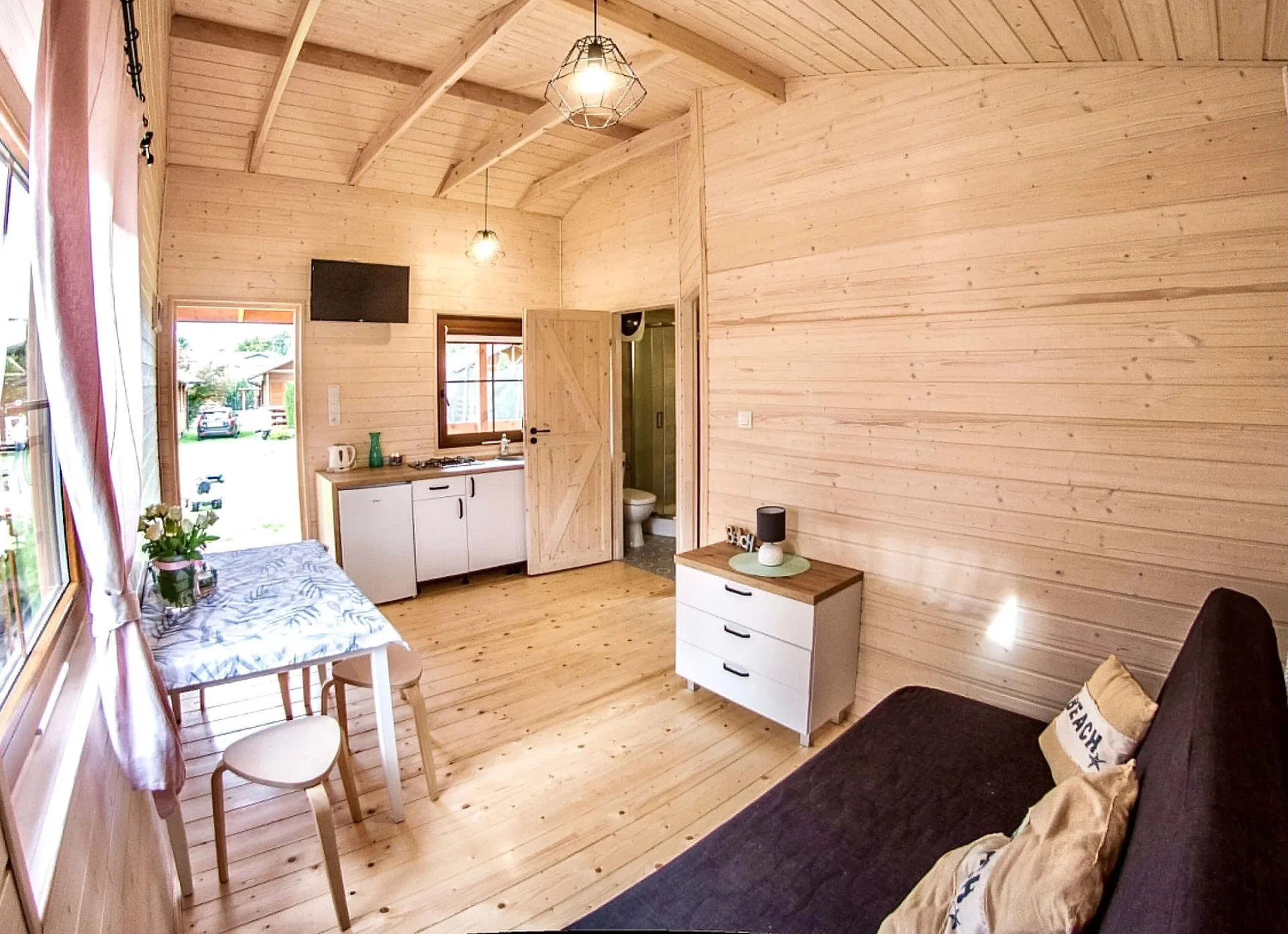 Do Państwa dyspozycji oddajemy komfortowe drewniany domek letniskowy 4-osobowy/1-pokojowy lub 5-osobowy/2-pokojowy wyposażony w: