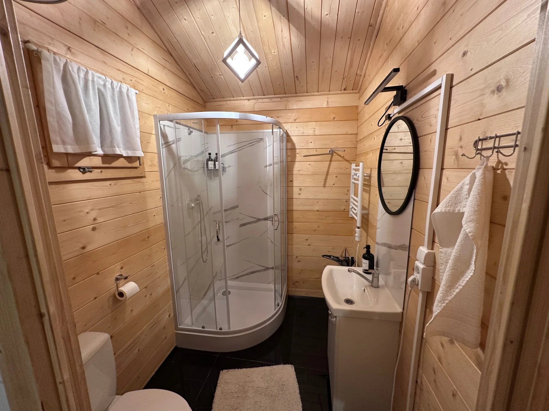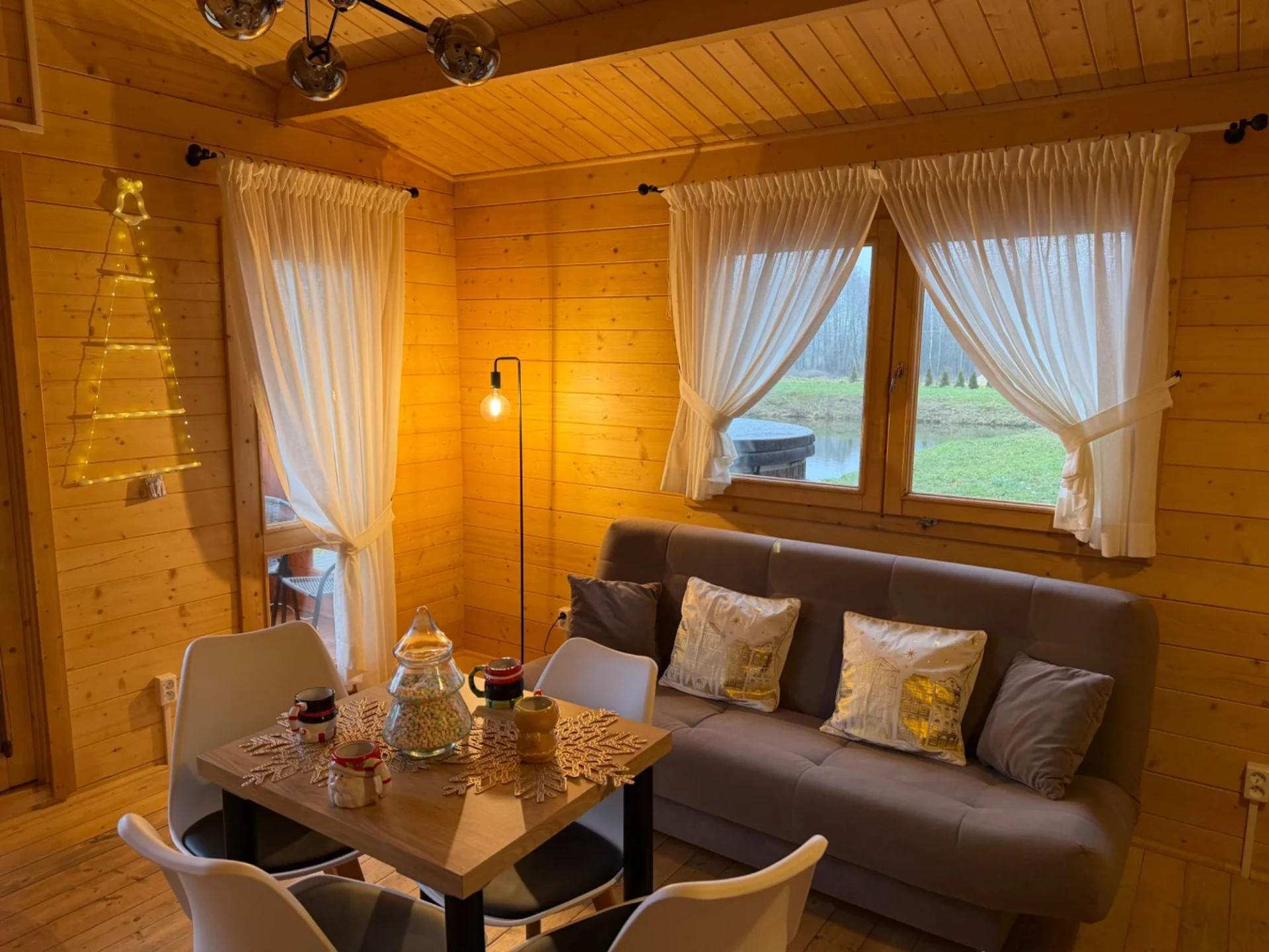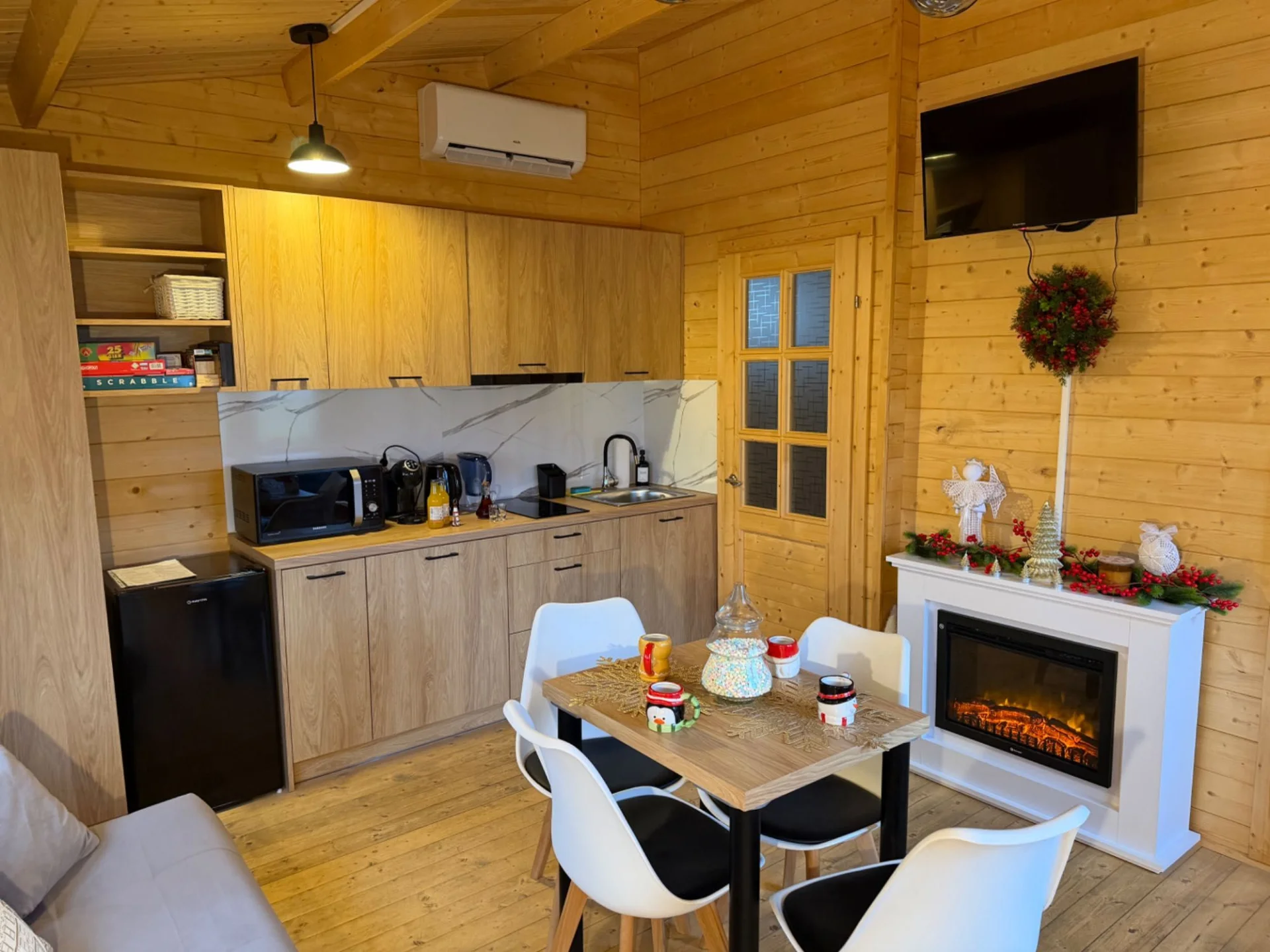 - zakwaterowanie w świeżo wybudowanym, w pełni wyposażonym, drewnianym domku z klimatyzacją, ogrzewaniem i kominkiem.