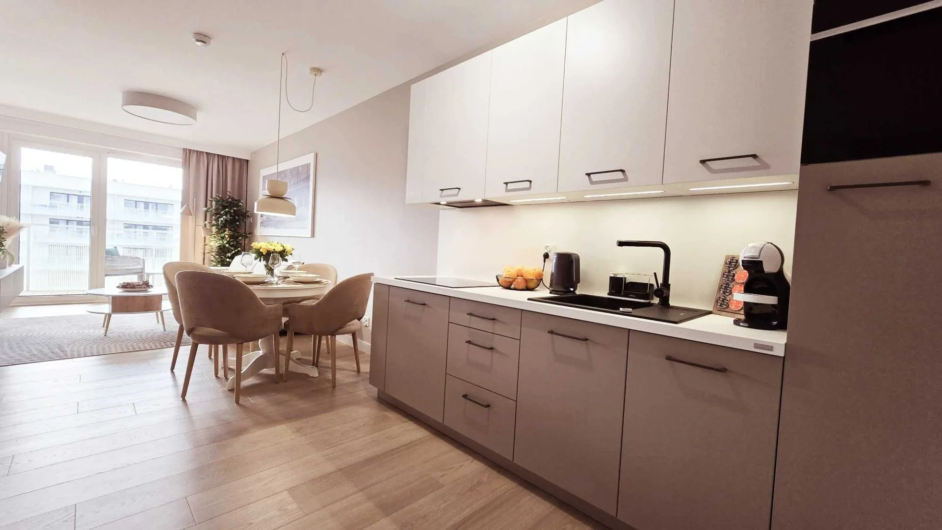 • w pełni wyposażoną kuchnię (lodówka, zmywarka, płyta indukcyjna, piekarnik, mikrofalówka)