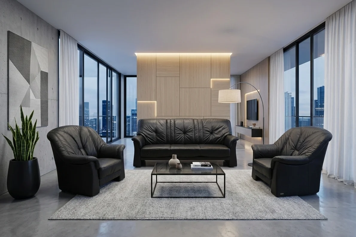 Prezentujemy wyjątkowy komplet wypoczynkowy, który łączy w sobie ponadczasową elegancję czarnej skóry z niezrównanym komfortem.