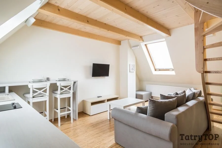 Opis Do wynajęcia NA KRUPÓWKACH wygodne i piękne, stylowe mieszkanie w samym centrum Zakopanego. Z widokiem na góry i wszystkimi potrzebnymi udogodnieniami. Mieszkanie wygodnie pomieści 6 ośób. Powyższa cena to cena od osoby od doby przy kilku osobach. W rzeczywistości cena zależna od obłożenia i terminu. Zadzwoń a powiemy ile kosztuje konkretny pobyt. Mieszkanie składa się z salonu z ankeksem kuchennym w którym znajduje się rokładana dwuosobowa kanapa, antresoli z wygodnym dwu-osobowym materacem oraz niezależnej wydzielonej sypialni w której znajdują się dwa niezależne pojedyncze łóżka. W mieszkaniu znajduje się w pełni wyposażony aneks kuchenny wraz z wszytskimi udogonieniami, płytą kuchenną, czajnikiem, lodówką oraz ekspresem do kawy. Ponadto w mieszkaniu znajduje się pralka, ręczniki, pościel, żelazko, suszarka do włosów, suszarka na ubrania itd. Wszytko nowe. Cena zależna od terminu i obłożenia, oraz ilości osób, wolne jeszcze terminy na ferie. Możliwość samozameldowania po przedpłacie na konto. Wystawiamy faktury na pobyt. W celu wyceny terminu zadzwoń. Możliwość negocjacji ceny. Mieszkanie piękne.