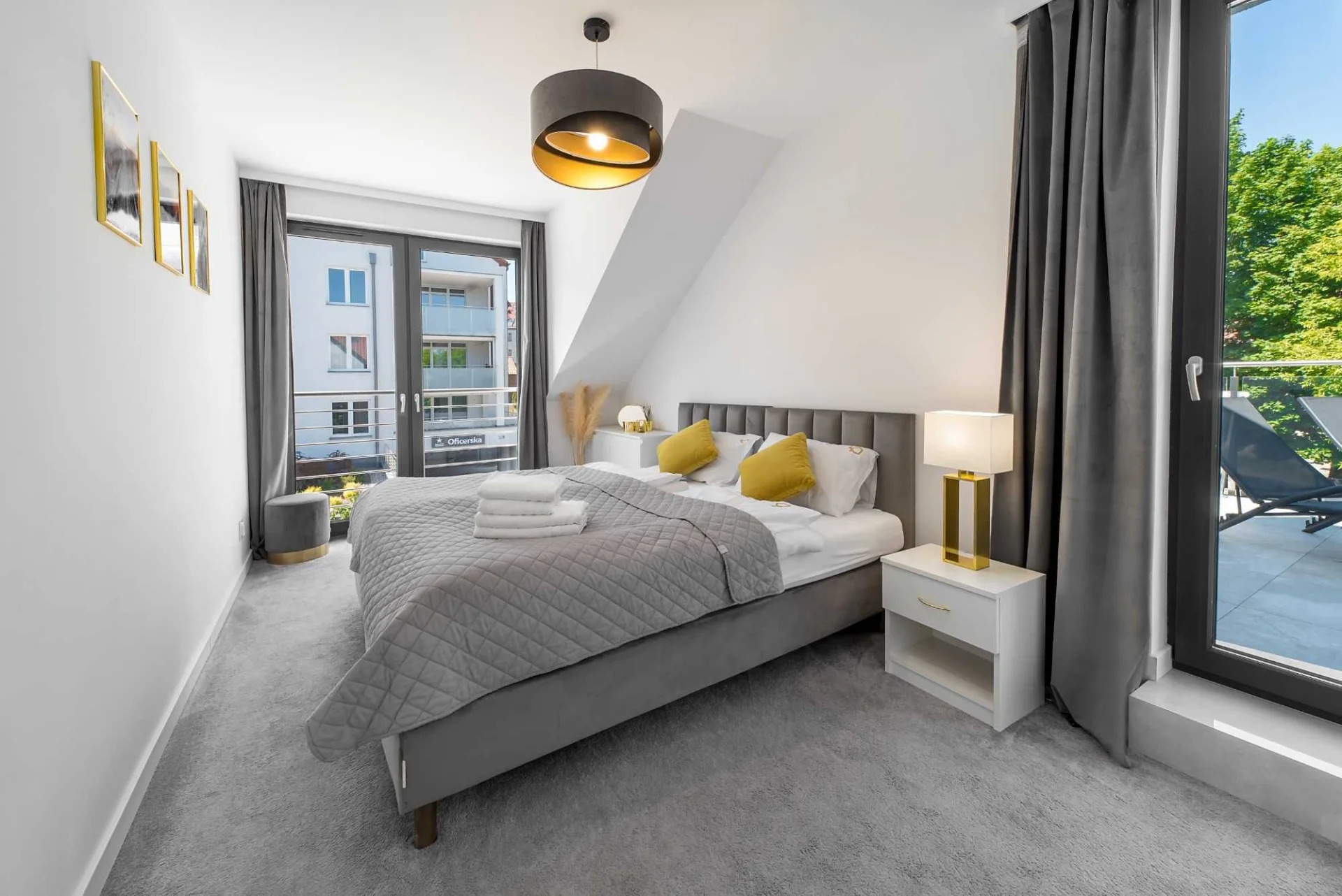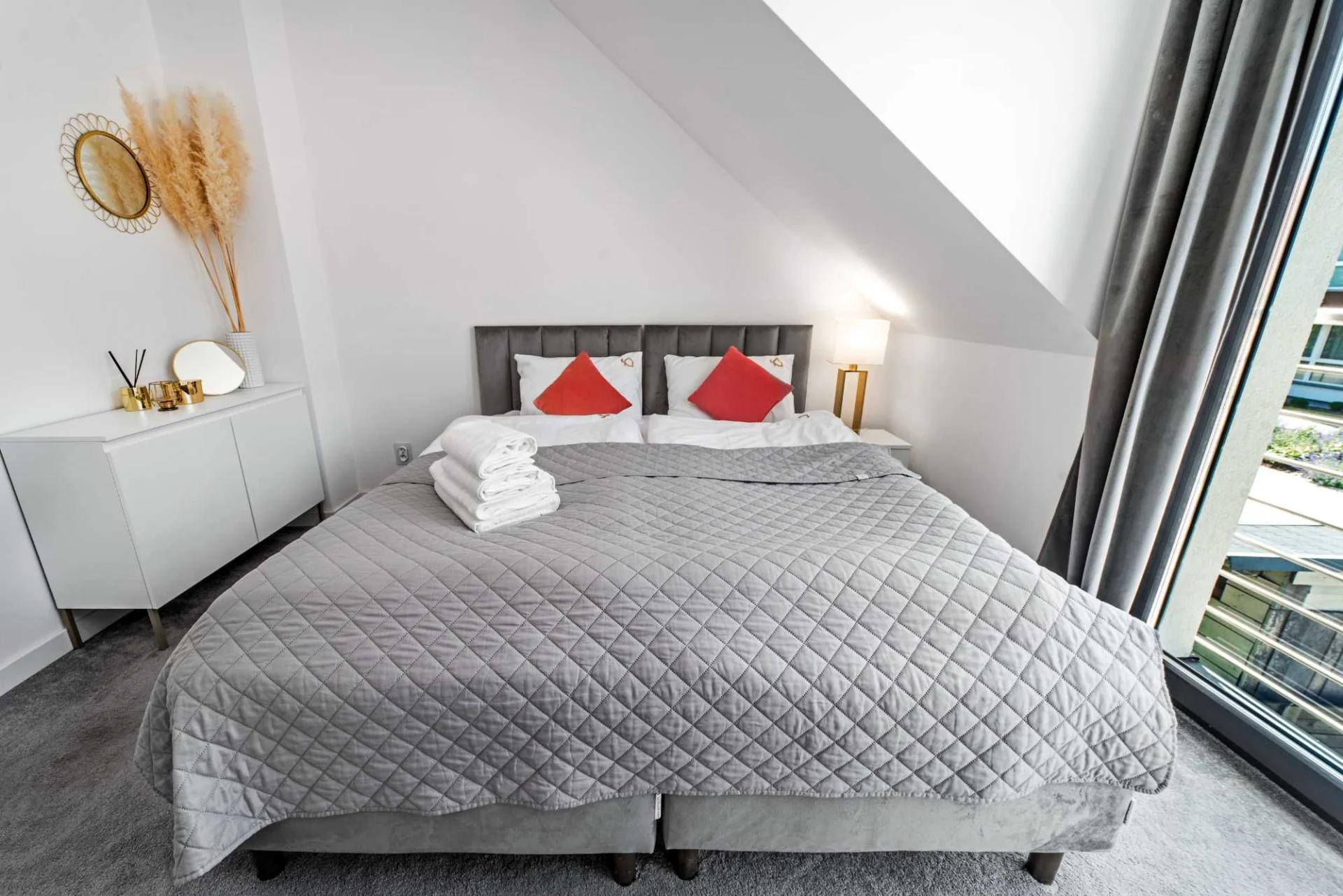 -Sypialnie: łóżka kontynentalne, pościel, komoda, pufy