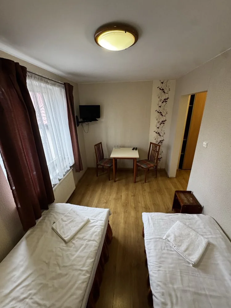 W każdym pokoju zainstalowany telewizor i telewizja naziemna, czajnik, szafa na ubrania, stolik, krzesła.