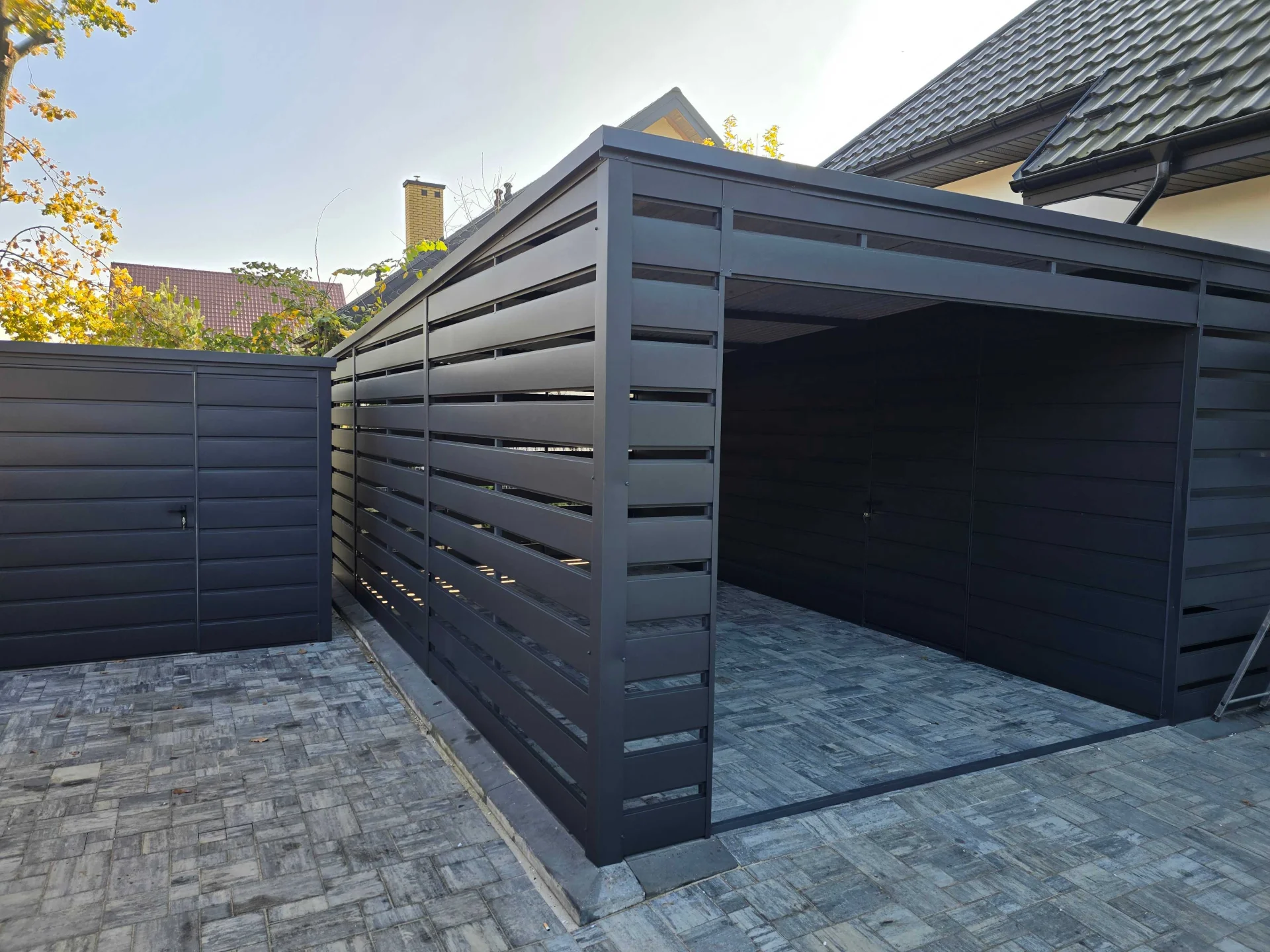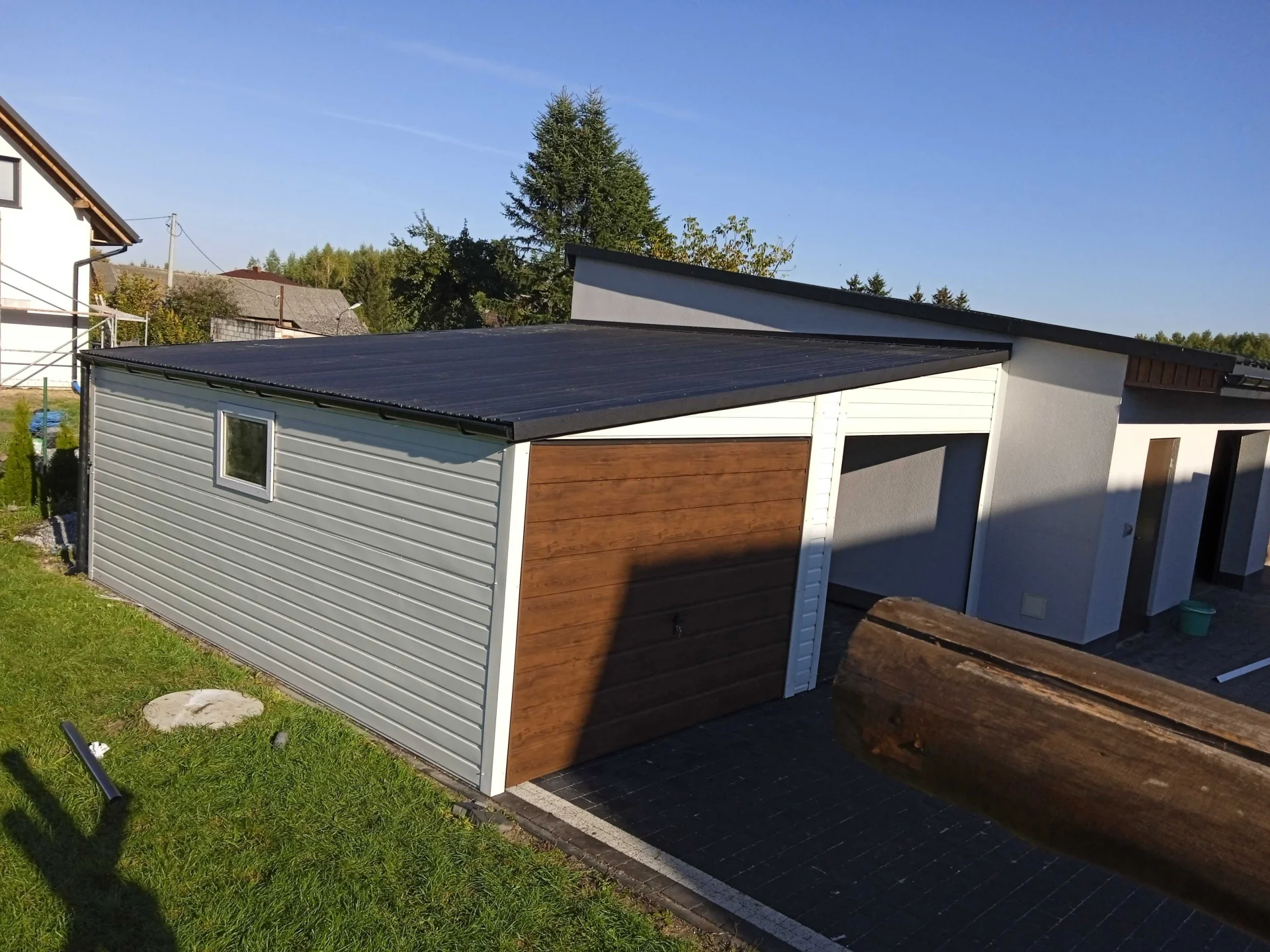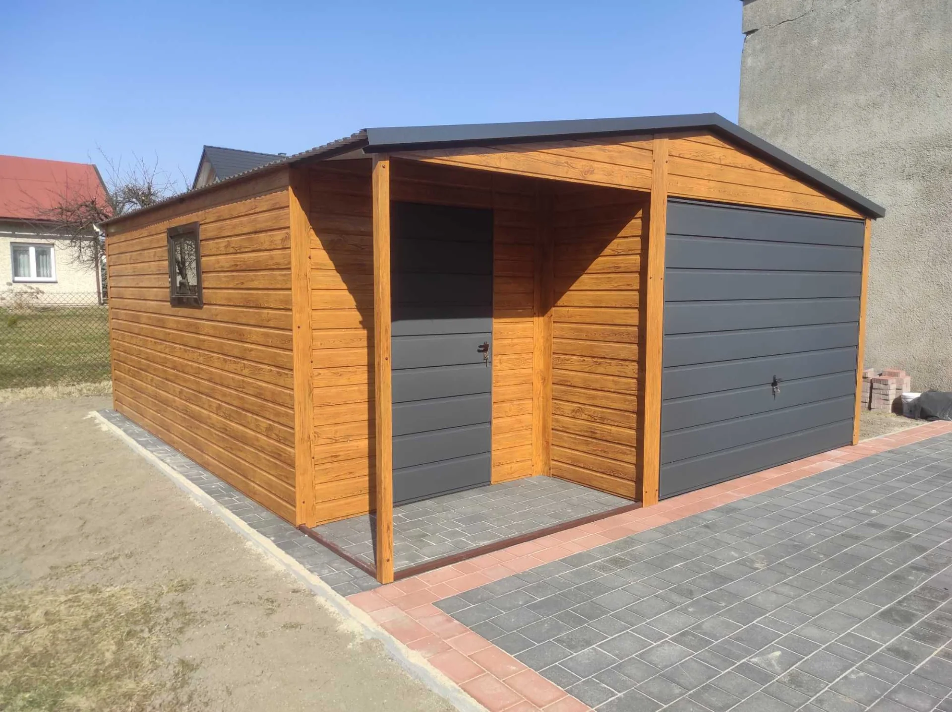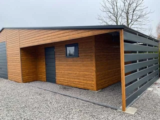 Dzięki zastosowaniu kolorystyki drewnopodobnej oraz szerokiemu trapezowi blachy przypominającemu deskę, nasze garaże w sposób efektywny komponują się z otoczeniem. Dodatkowym aspektem wizualnym są okucia blacharskie oraz pokrycie dachu blachodachówka które scalają garaż w spójną całość.
