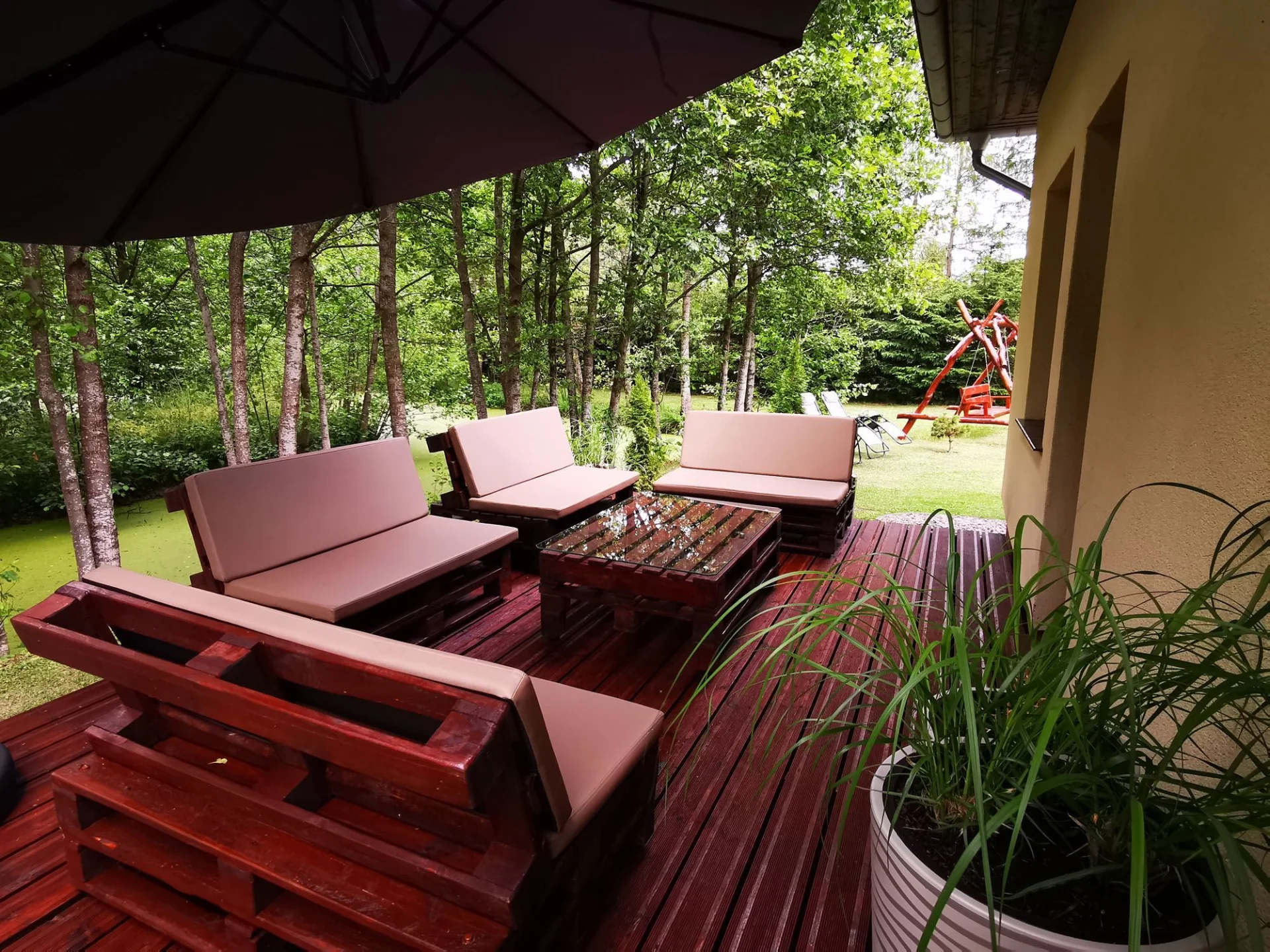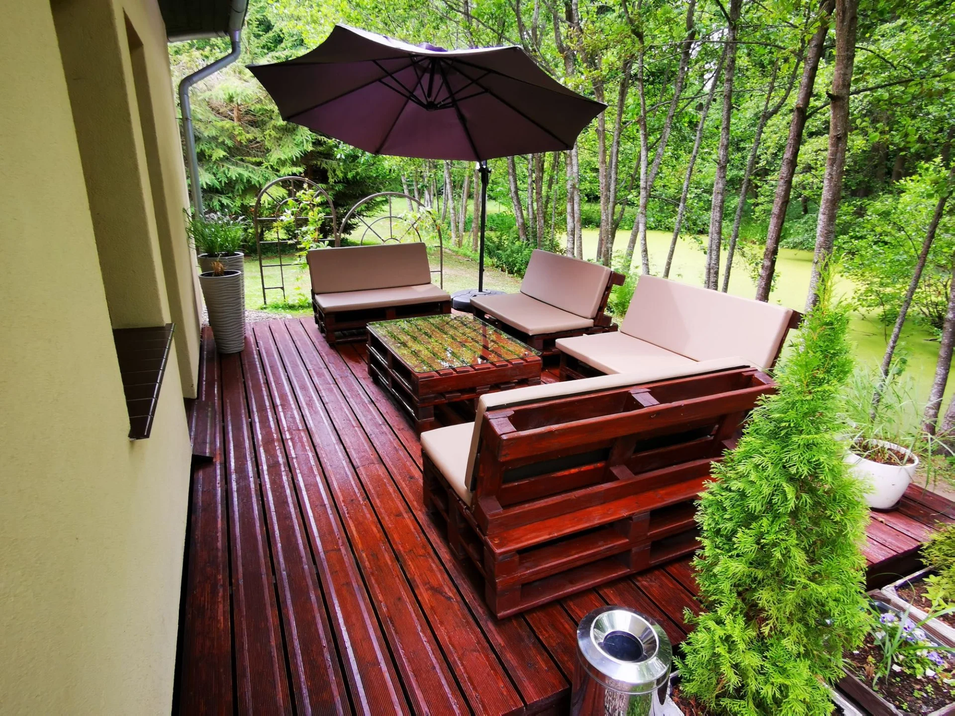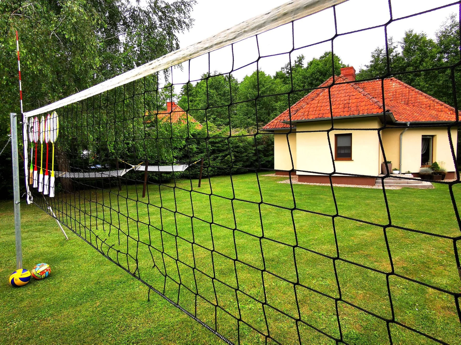 Do indywidualnego użytku: działka 3'000 m2, staw., boisko do siatkówki, taras, meble ogrodowe, miejsce na ognisko, łódź wiosłowa, prywatna plaża. Możliwość łowienia ryb (wymagane pozwolenie). Prywatny pomost właściciela dostępny dla gości.