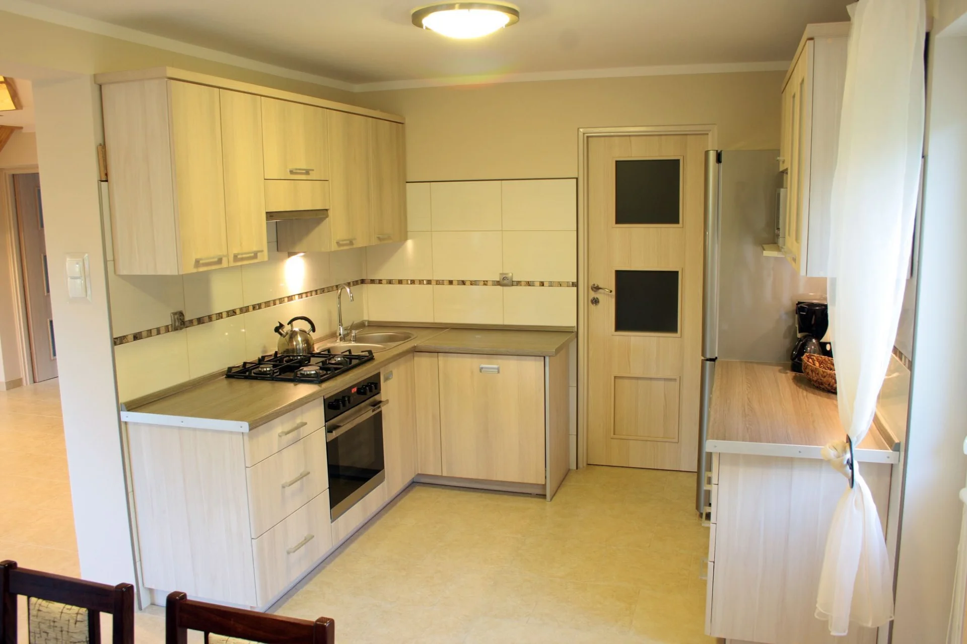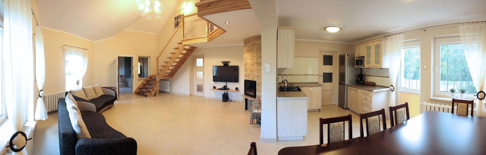 - aneks kuchenny z jadalnią i spiżarnią (kuchenka gazowa 4-palnikowa, piekarnik, zmywarka do naczyń, kuchenka mikrofalowa, czajnik elektryczny, ekspres do kawy)