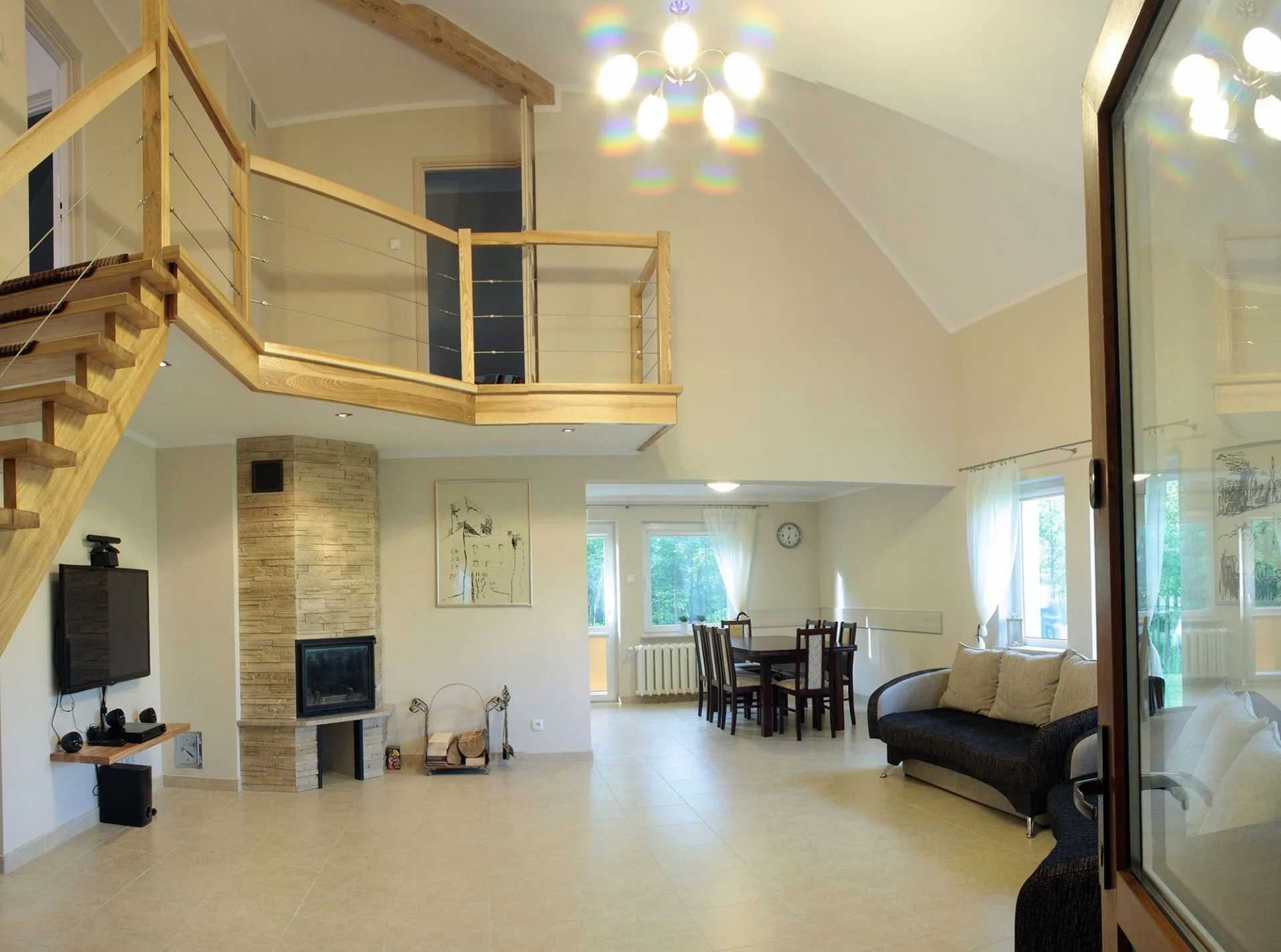 - otwarty salon 40 m2 z dwoma kanapami, kominkiem i sprzętem RTV z nagłośnieniem.