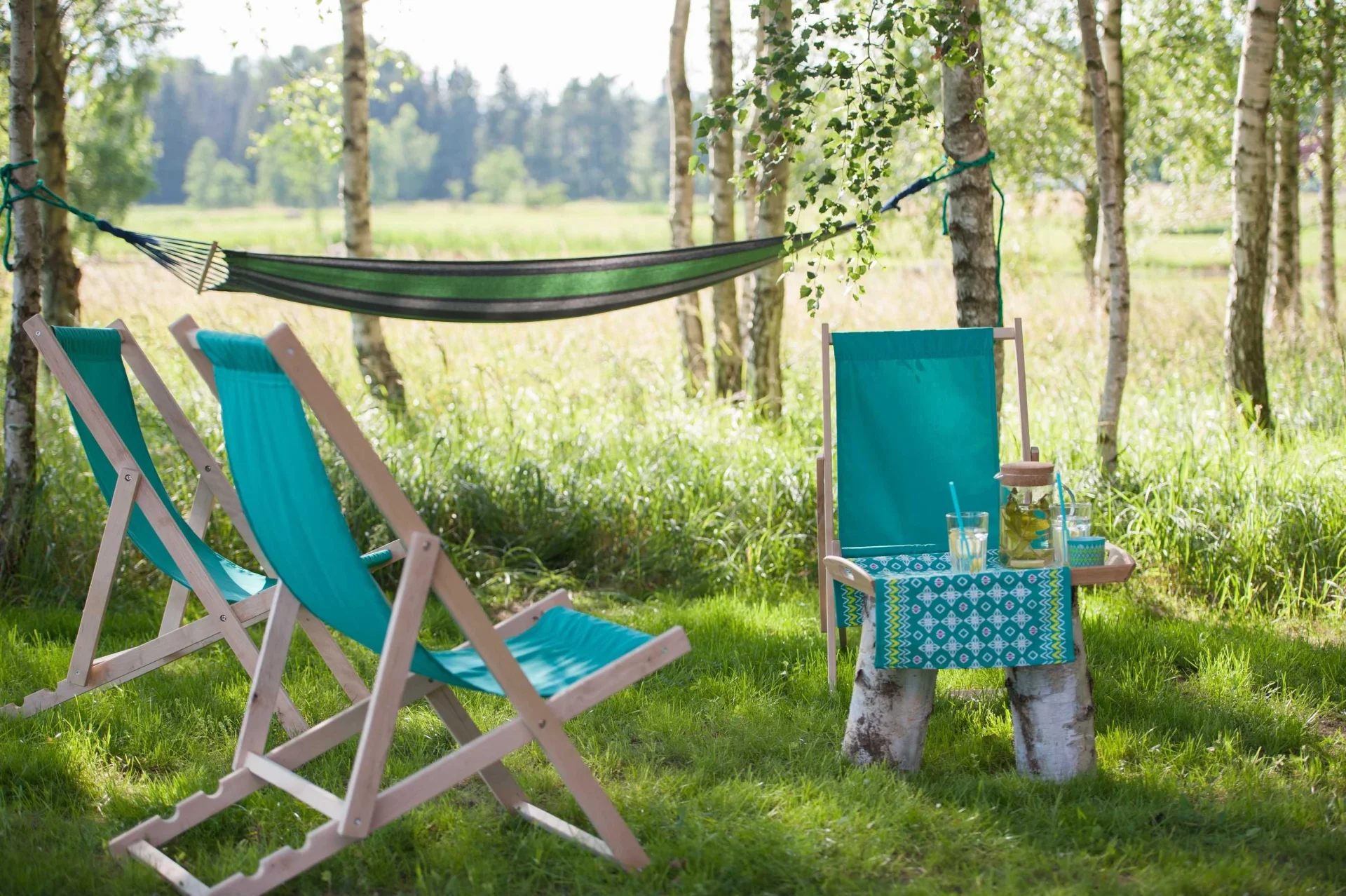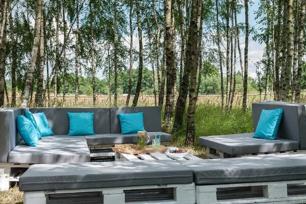 - leśny salon z palet / fotele brazylijskie, leżaki, hamaki