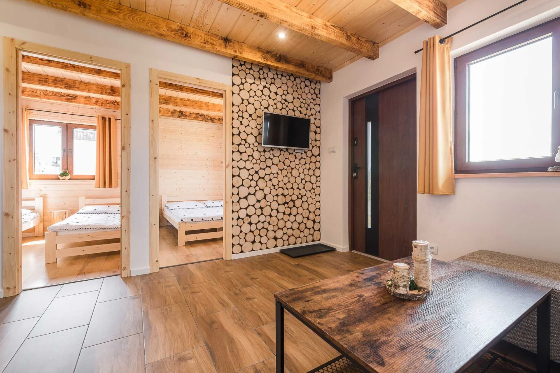 - 2 sypialnie ( pierwsza z łóżkiem małżeńskim oraz druga z 2 łóżkami pojedynczymi - z możliwością połączenia),