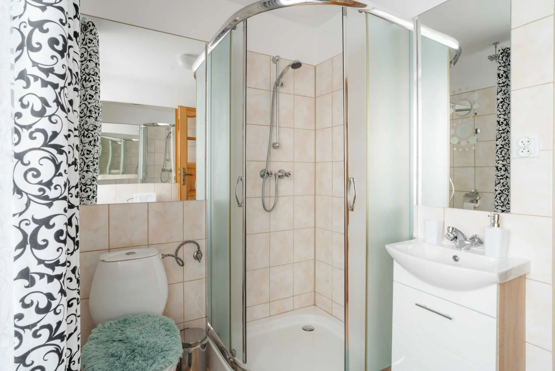 Apartament posiada przestronną łazienkę z prysznicem, ręczniki, szlafroki, klimatyzację, darmowe Wi-Fi, zestaw powitalny: czajnik, kawa, herbata.