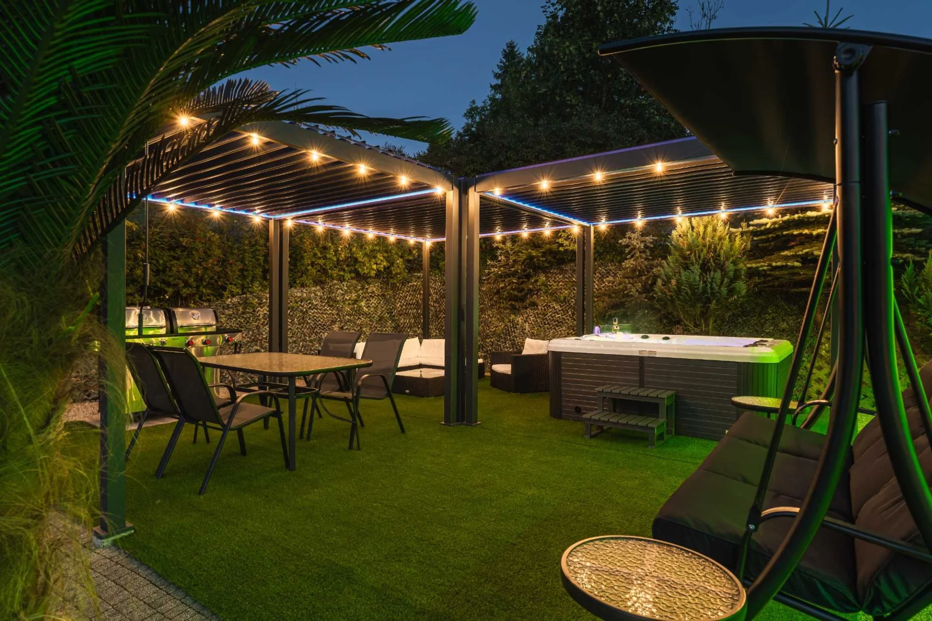 Do dyspozycji naszych gości strefa relaksu: przestronny całoroczny ogród otwarty z zadaszeniem w postaci pergoli z ruchomymi lamelami ,w którym znajdują się: jacuzzi ogrodowe, grill węglowy lub gazowy do wyboru, wypoczynkowe meble ogrodowe ,huśtawka , darmowe wifi, palenisko z ruchomym rusztem.